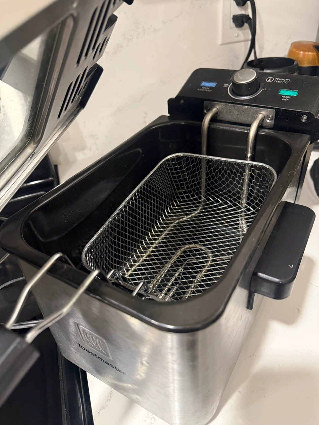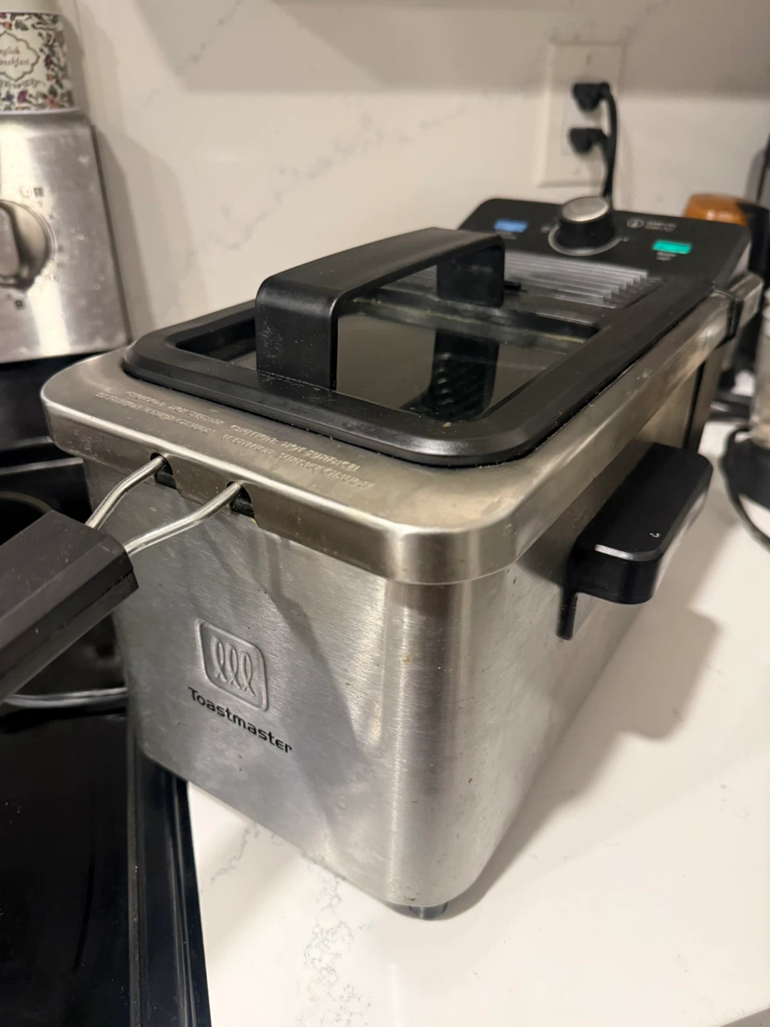 Toastmaster deep fryer with a stainless steel exterior. Includes a frying basket with handles. Great for making crispy fries or other fried foods!