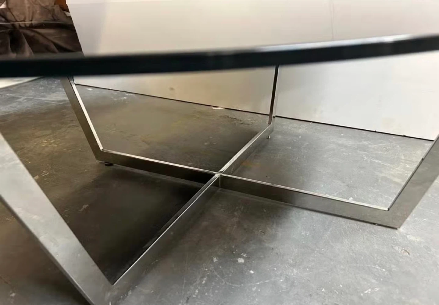 This round coffee table features a sleek black glass top and a sturdy brushed metal base. Its modern design fits well in contemporary living spaces. Metal frame and glass construction.