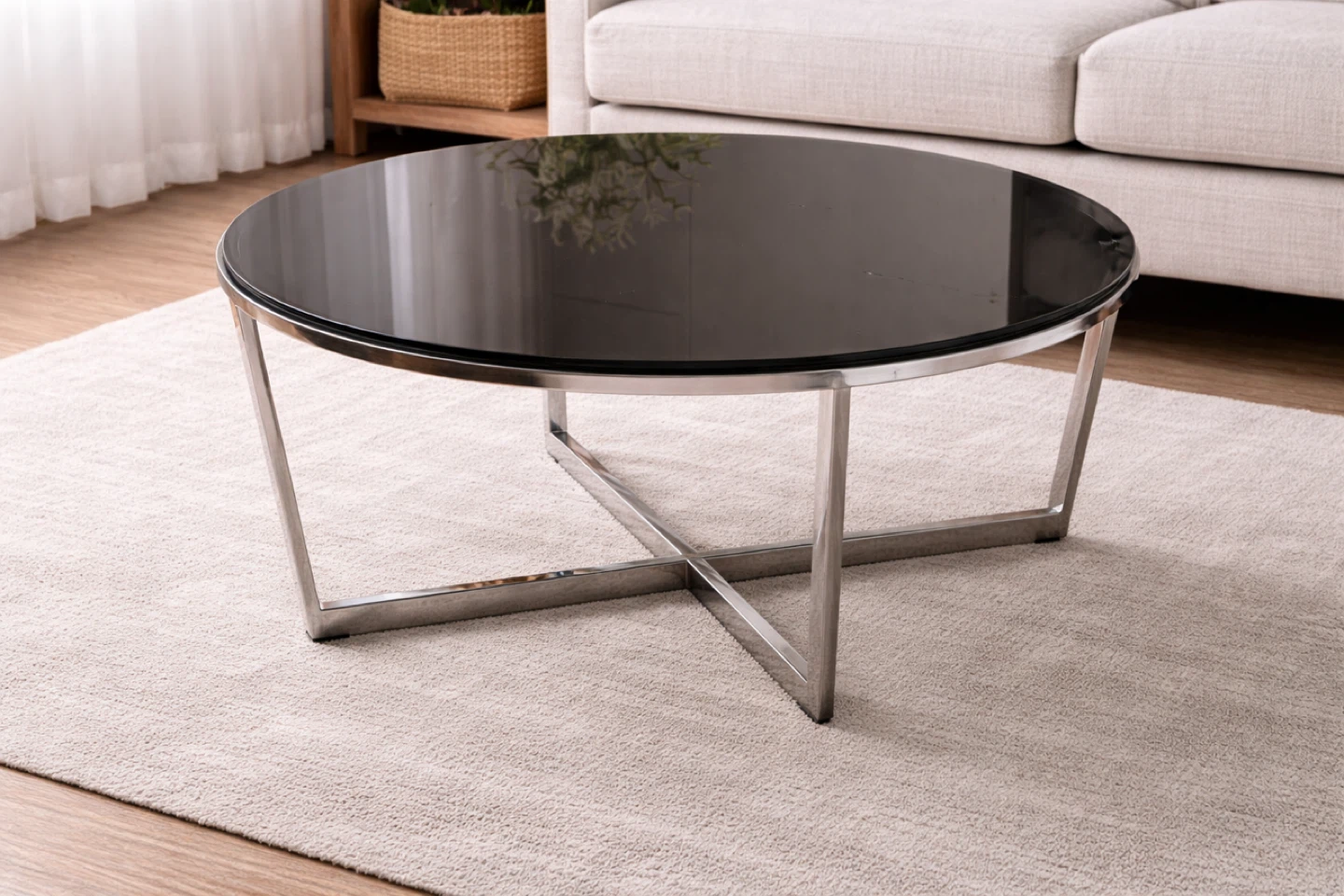 This round coffee table features a sleek black glass top and a sturdy brushed metal base. Its modern design fits well in contemporary living spaces. Metal frame and glass construction.