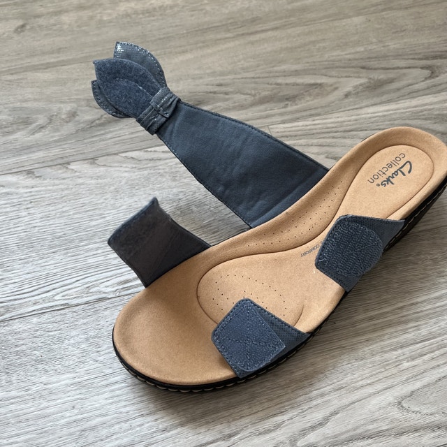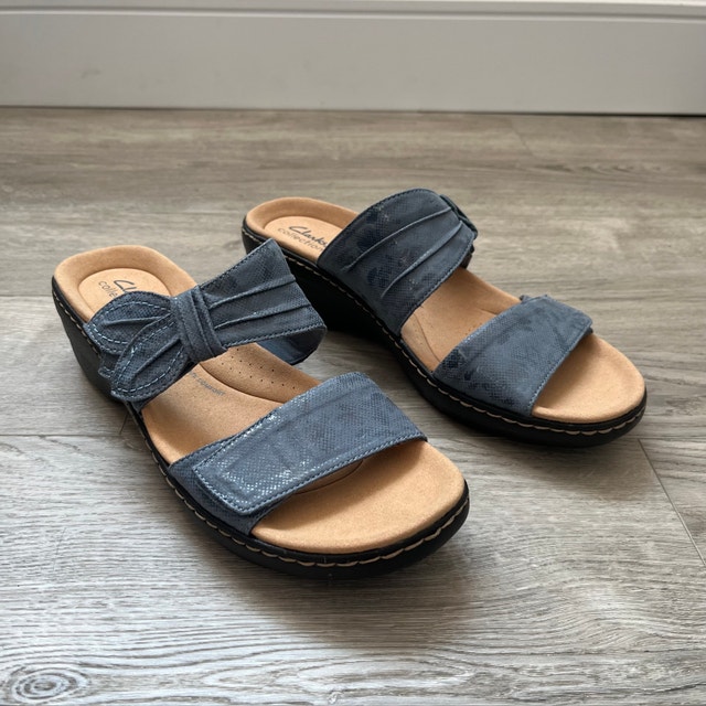 Step into comfort with these Clarks Collection blue sandals, designed in a women's size 9.5 for ultimate comfort and style. These sandals feature a stylish bow detail and adjustable straps, perfect for everyday wear. Key features include: