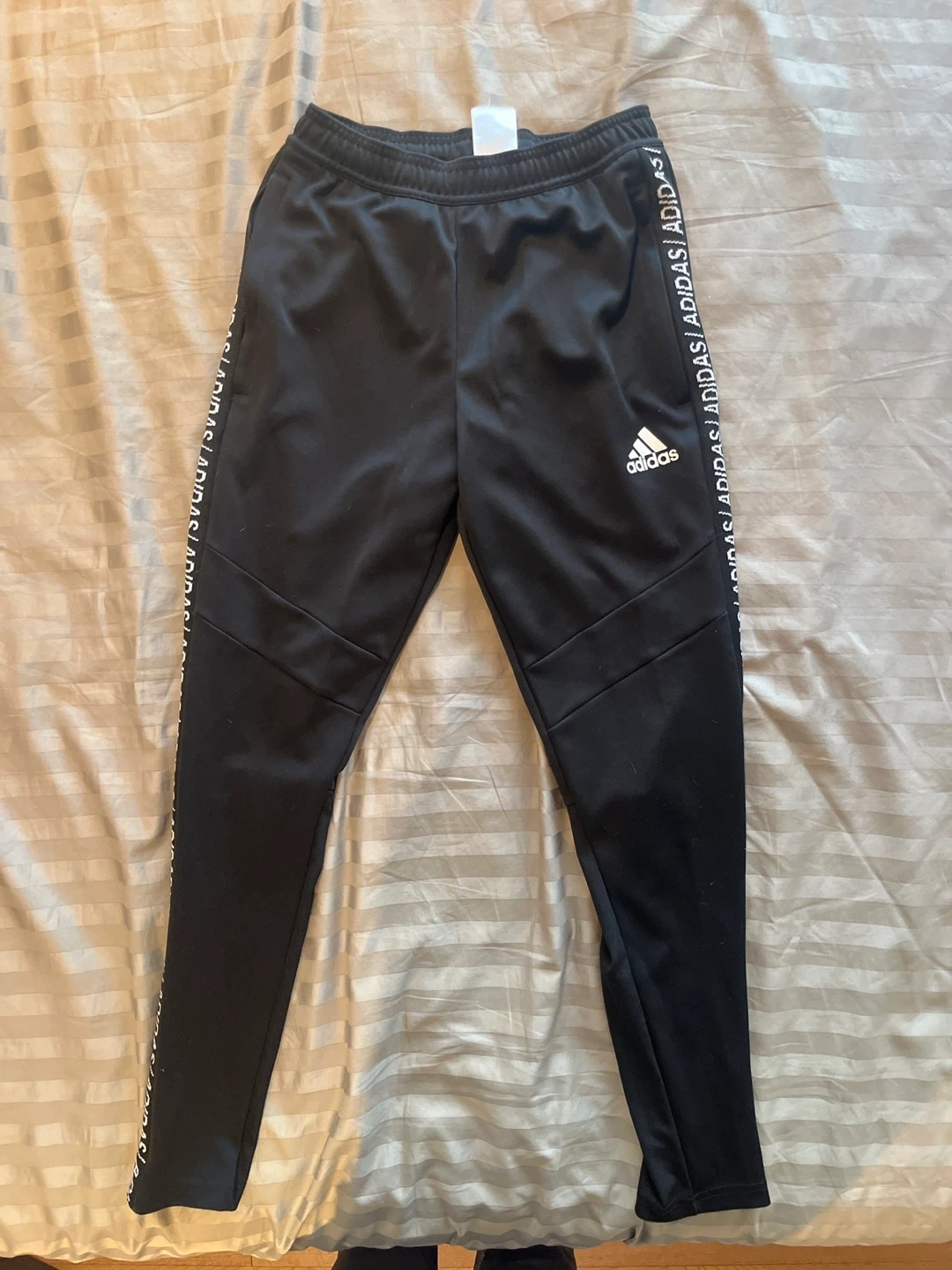 Selling a pair of Adidas black track pants in size XS. These pants feature the Adidas logo and lettering down the sides. They are in great condition and ready for a new home!