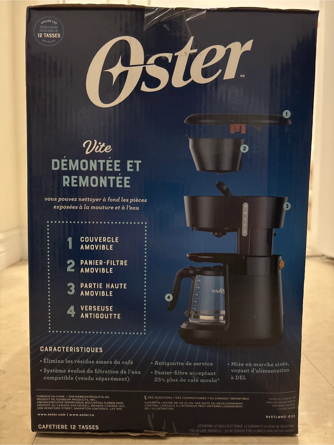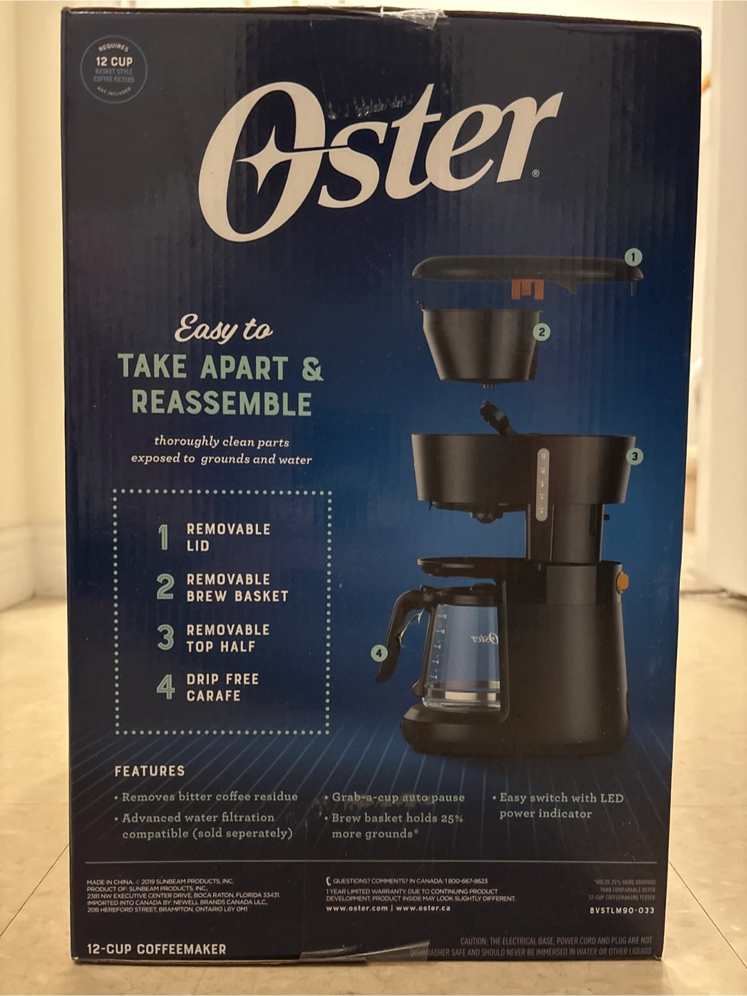 Selling a brand new Oster 12-cup coffeemaker! This coffeemaker features an easy-to-clean, dishwasher-safe design for better-tasting coffee. It's easy to take apart and reassemble, with thoroughly clean parts exposed to grounds and water. The box includes a removable lid, brew basket, top half, and drip-free carafe. It also removes bitter coffee residue and has advanced water filtration compatible (sold separately). Enjoy grab-a-cup auto-pause and an easy switch with LED power indicator
