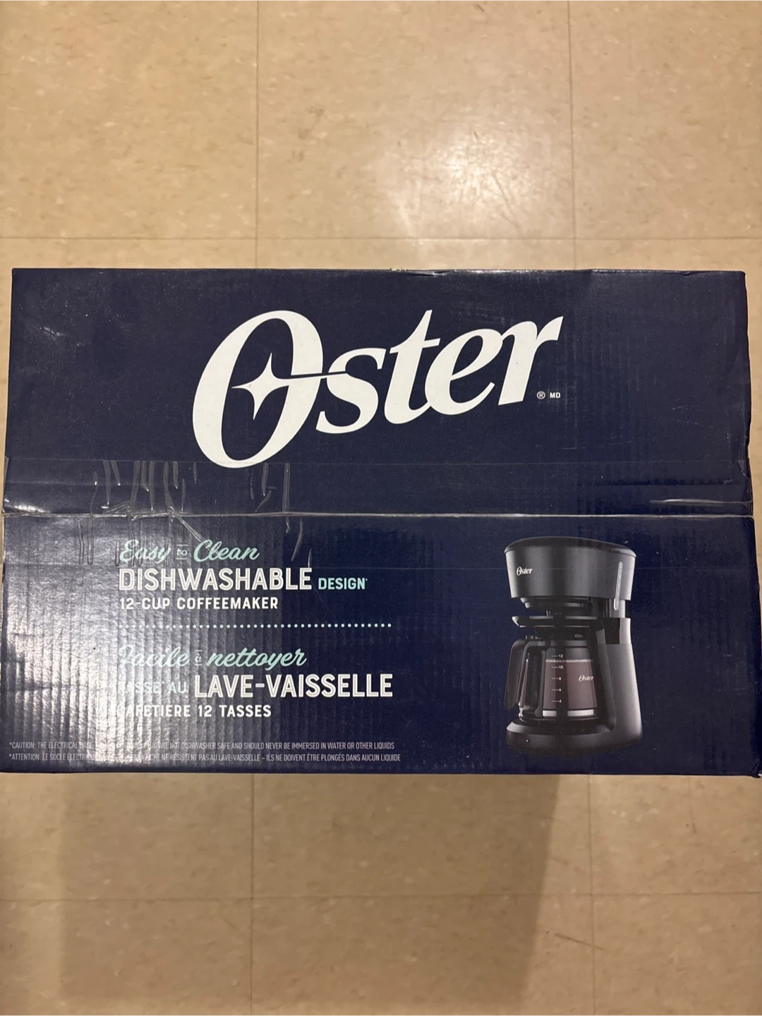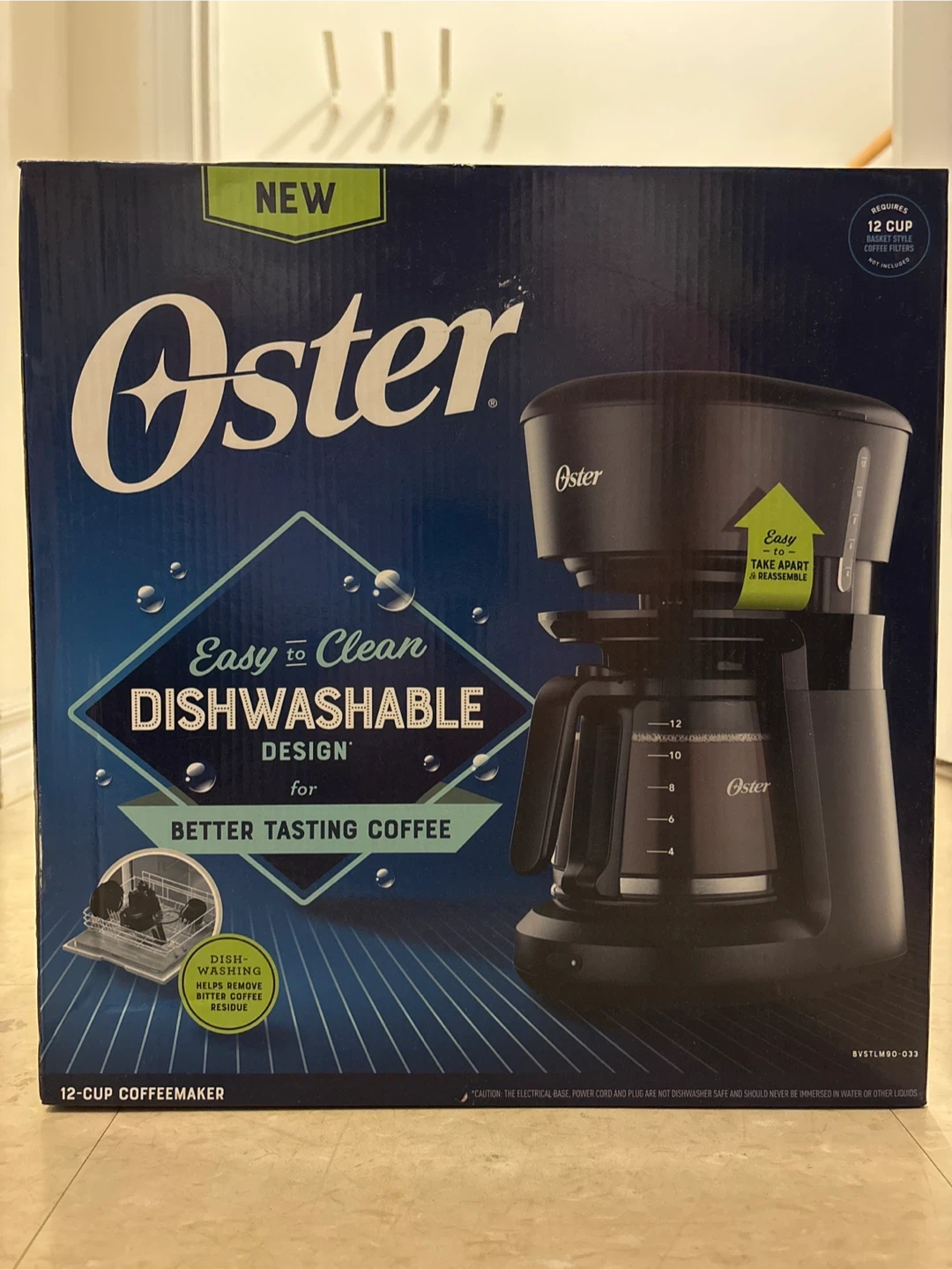 Selling a brand new Oster 12-cup coffeemaker! This coffeemaker features an easy-to-clean, dishwasher-safe design for better-tasting coffee. It's easy to take apart and reassemble, with thoroughly clean parts exposed to grounds and water. The box includes a removable lid, brew basket, top half, and drip-free carafe. It also removes bitter coffee residue and has advanced water filtration compatible (sold separately). Enjoy grab-a-cup auto-pause and an easy switch with LED power indicator