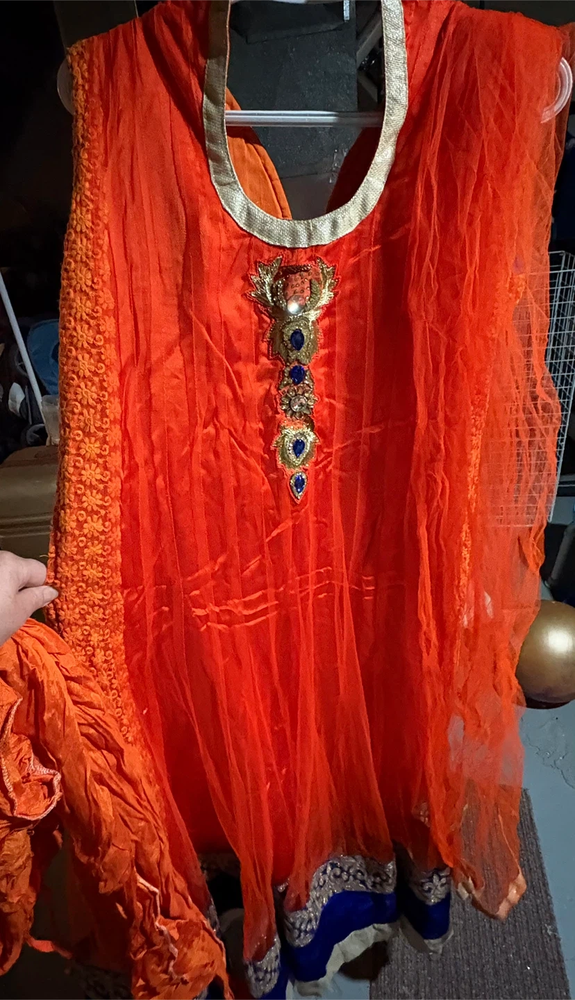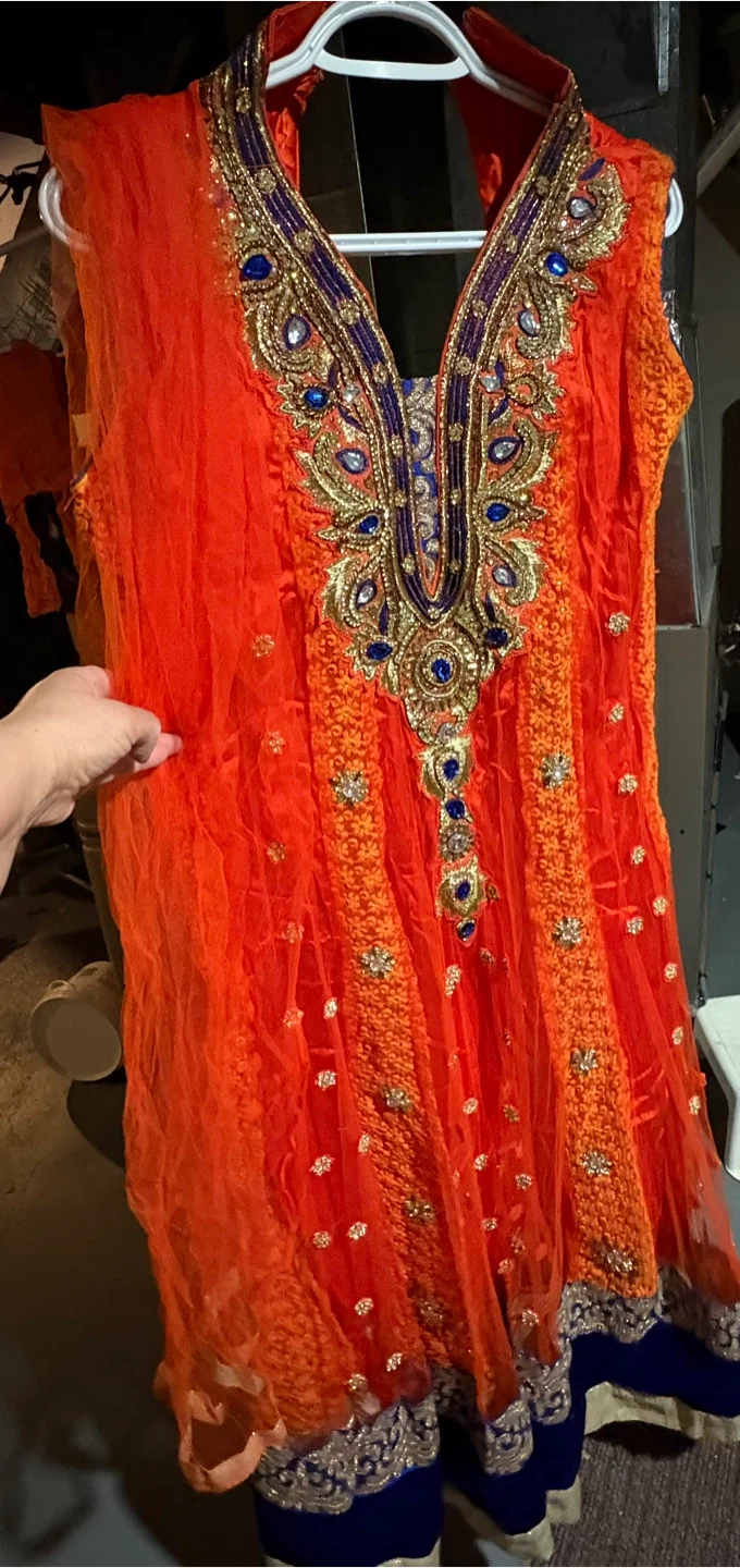 Bright orange embroidered kameez shalwar set. Features intricate gold and blue beading on the neckline and hem. Comes with a matching crinkled dupatta. Perfect for festive occasions!
