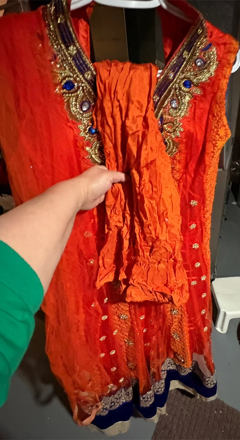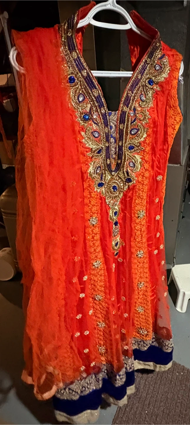 Bright orange embroidered kameez shalwar set. Features intricate gold and blue beading on the neckline and hem. Comes with a matching crinkled dupatta. Perfect for festive occasions!