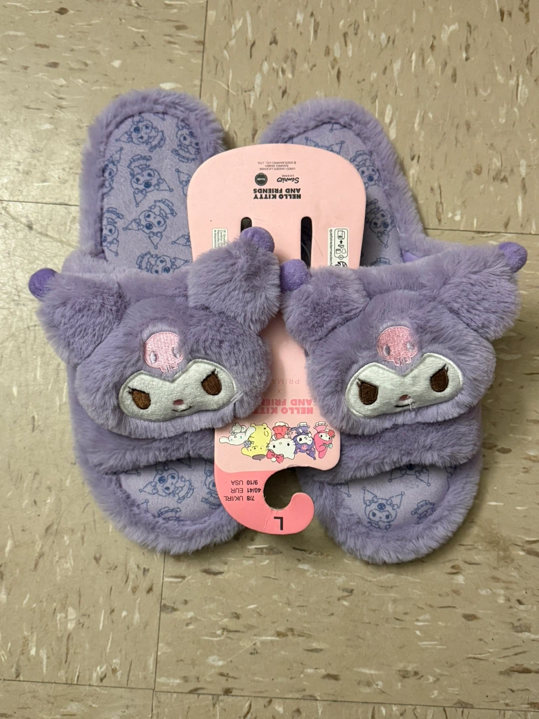 Fuzzy purple slippers featuring Hello Kitty and Friends characters. These slippers are size L, fitting UK/IRL 7/8, EUR 40/41, and USA 9/10. Made with a soft, plush material for comfort.