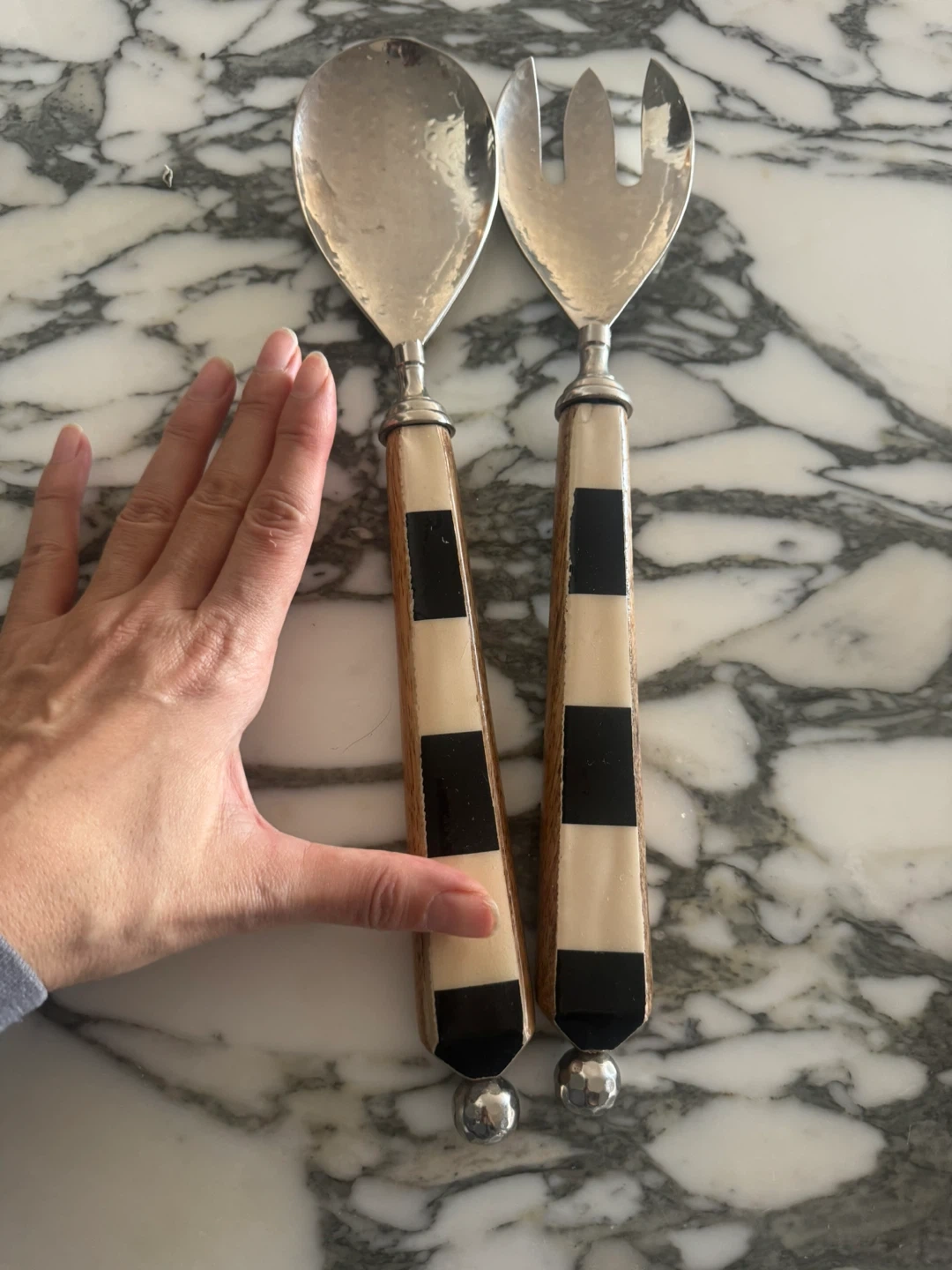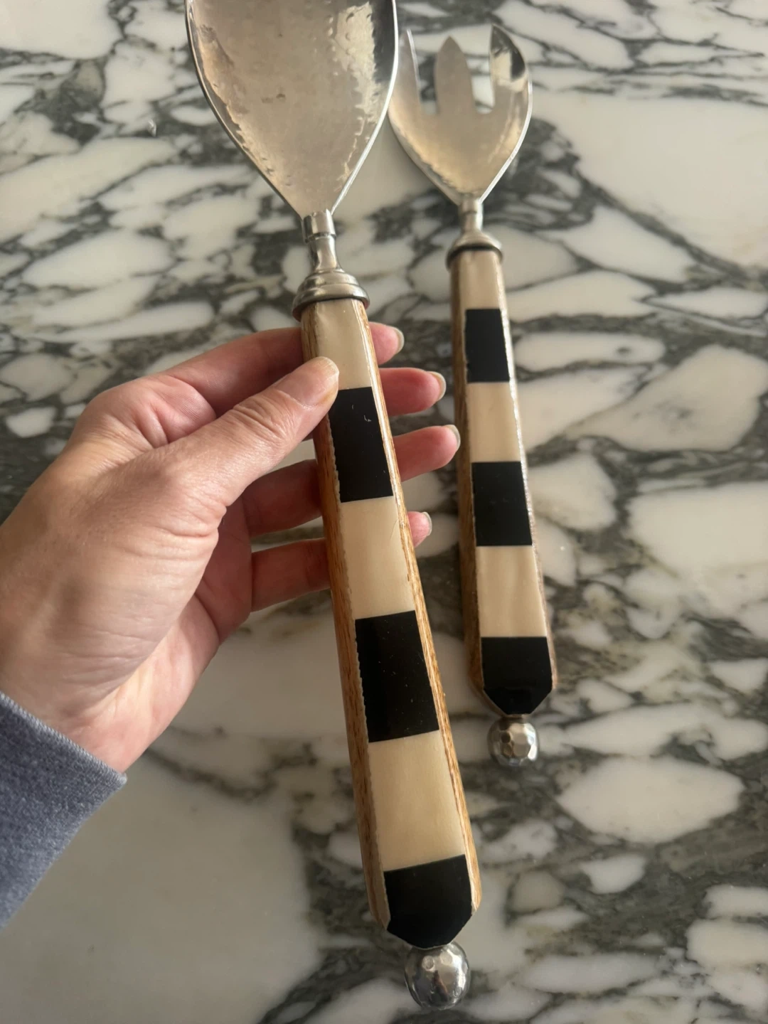 This is a set of salad servers. They feature hammered metal serving heads. The handles have a black and white checkered pattern. They're great for serving salads!