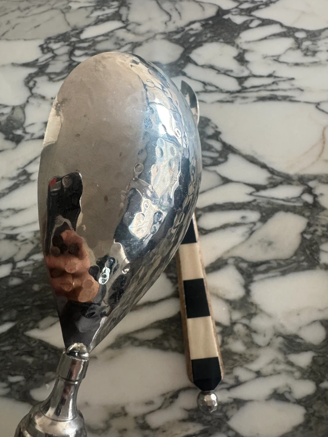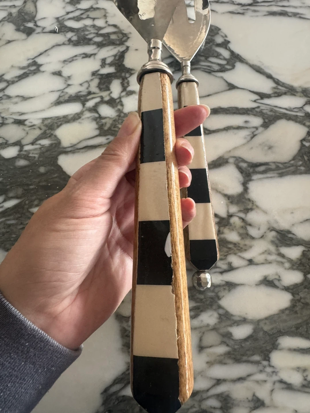 This is a set of salad servers. They feature hammered metal serving heads. The handles have a black and white checkered pattern. They're great for serving salads!