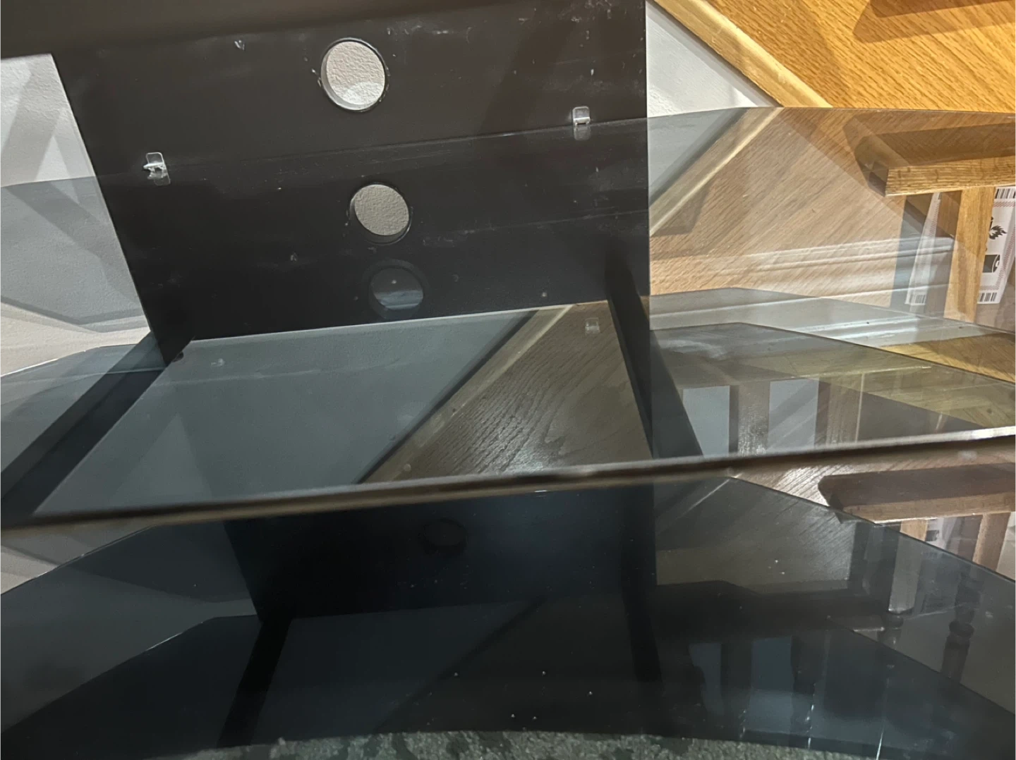 Selling a black glass TV stand. It's in great condition and ready for a new home! Perfect for your living room or entertainment area. The stand has a sleek design and provides ample space for your media devices and accessories. W 50.5 in X D 20.5 in X H 18 in