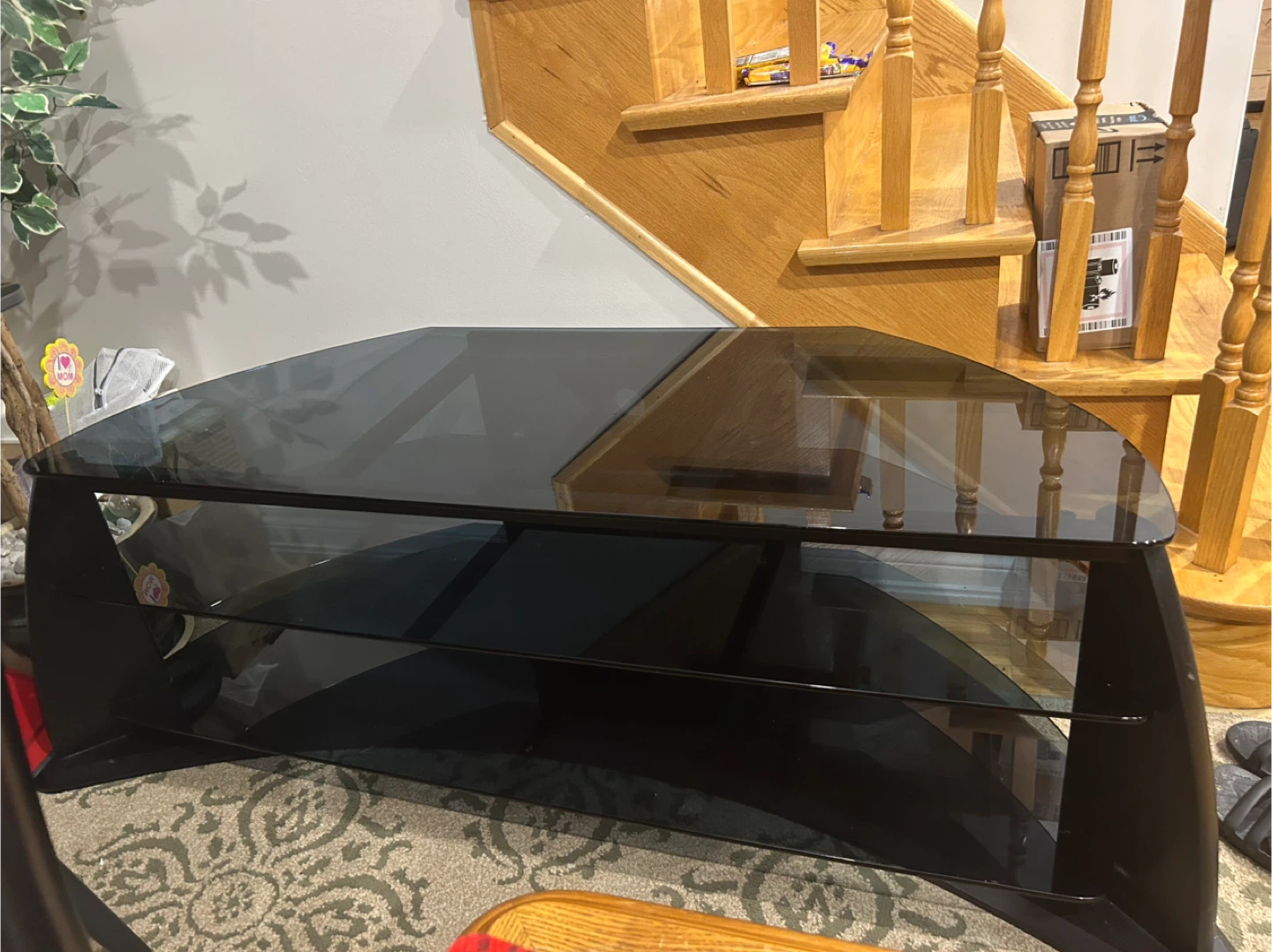 Selling a black glass TV stand. It's in great condition and ready for a new home! Perfect for your living room or entertainment area. The stand has a sleek design and provides ample space for your media devices and accessories. W 50.5 in X D 20.5 in X H 18 in