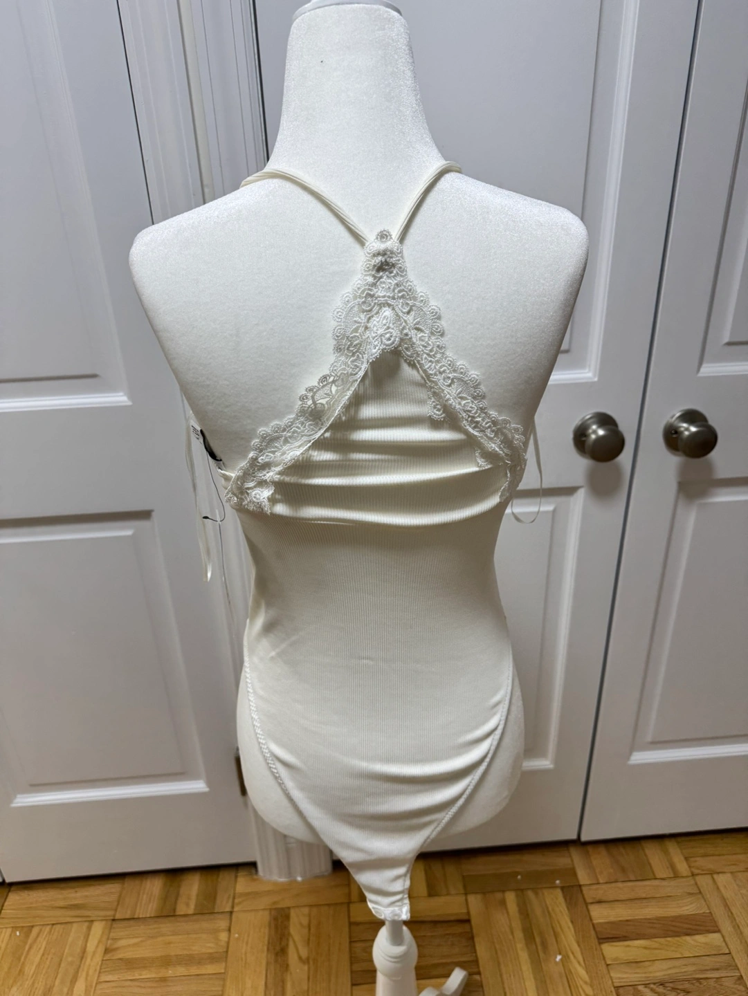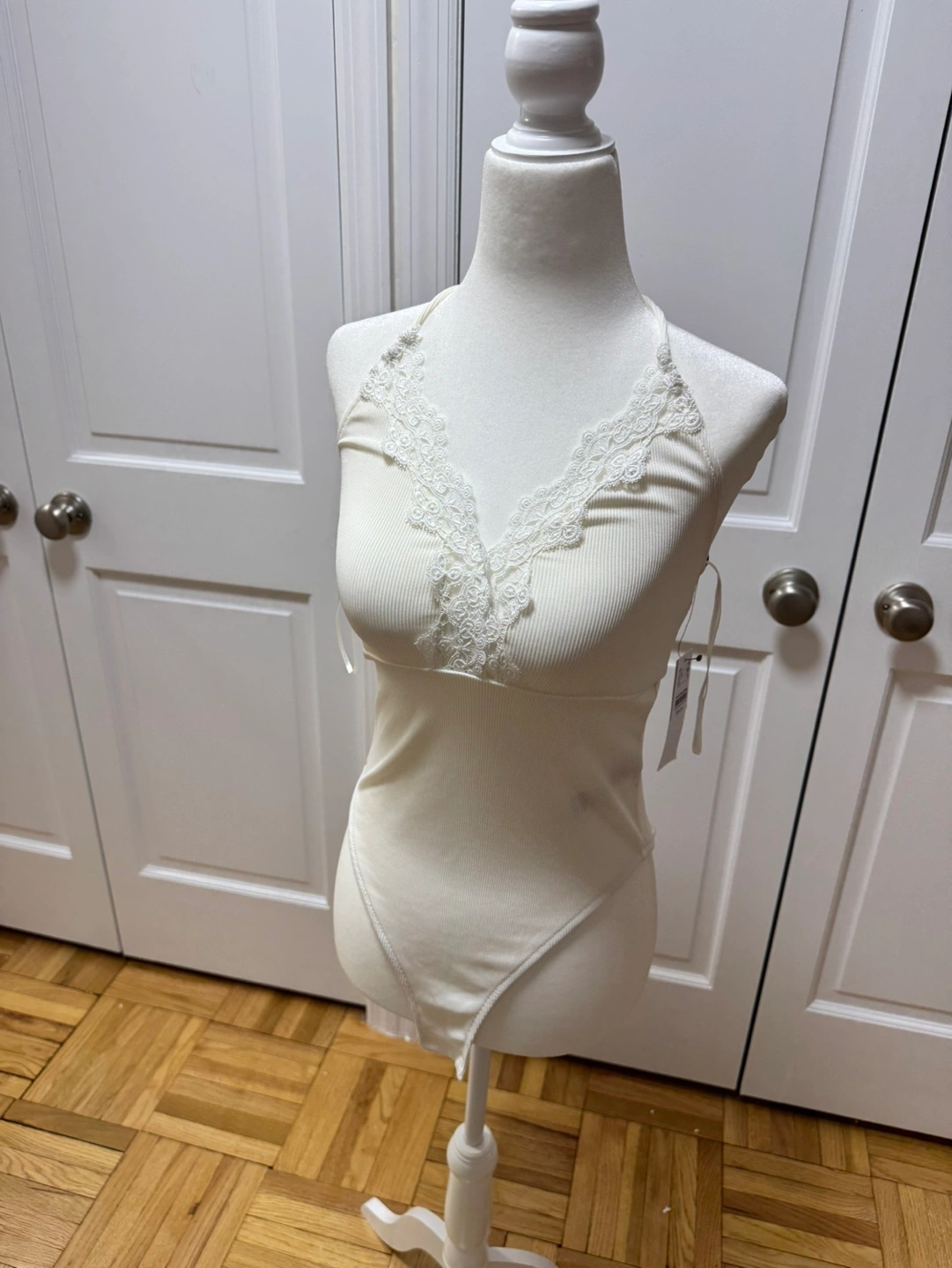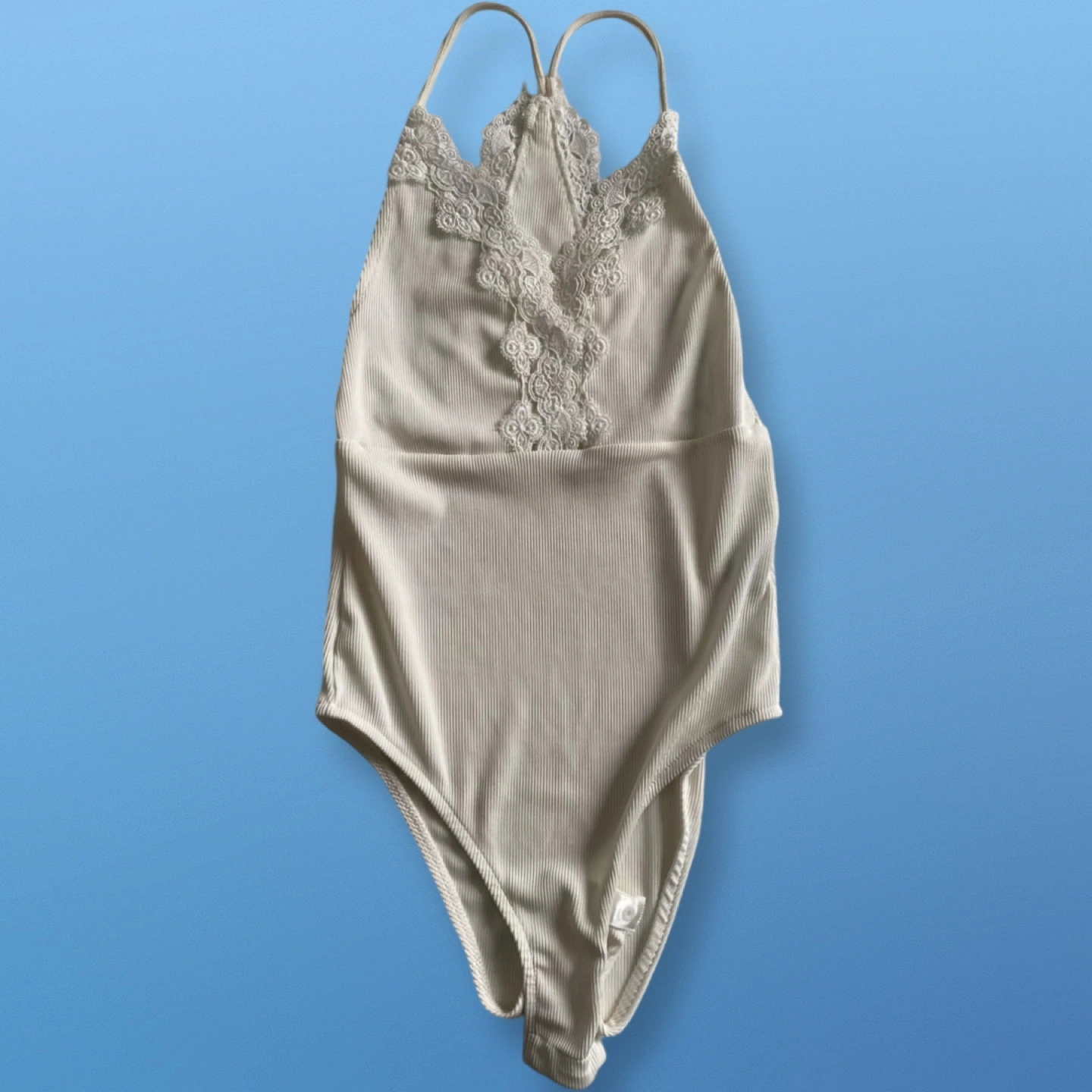 New with tags. Cream ribbed bodysuit. Features delicate lace detailing at neckline and back. Retails $35