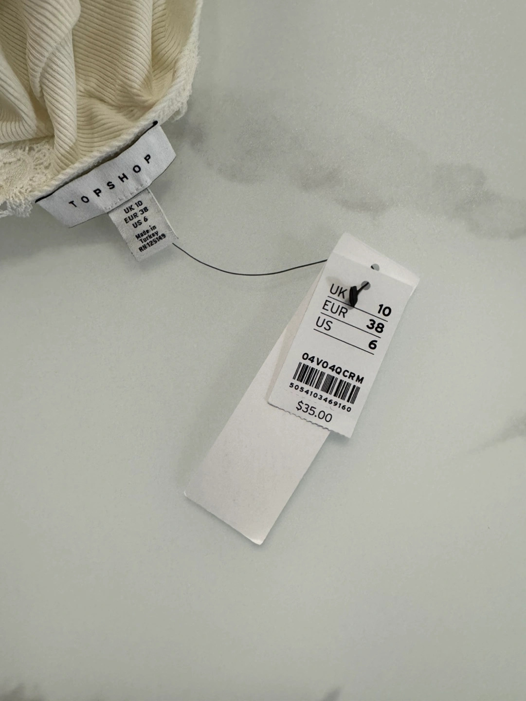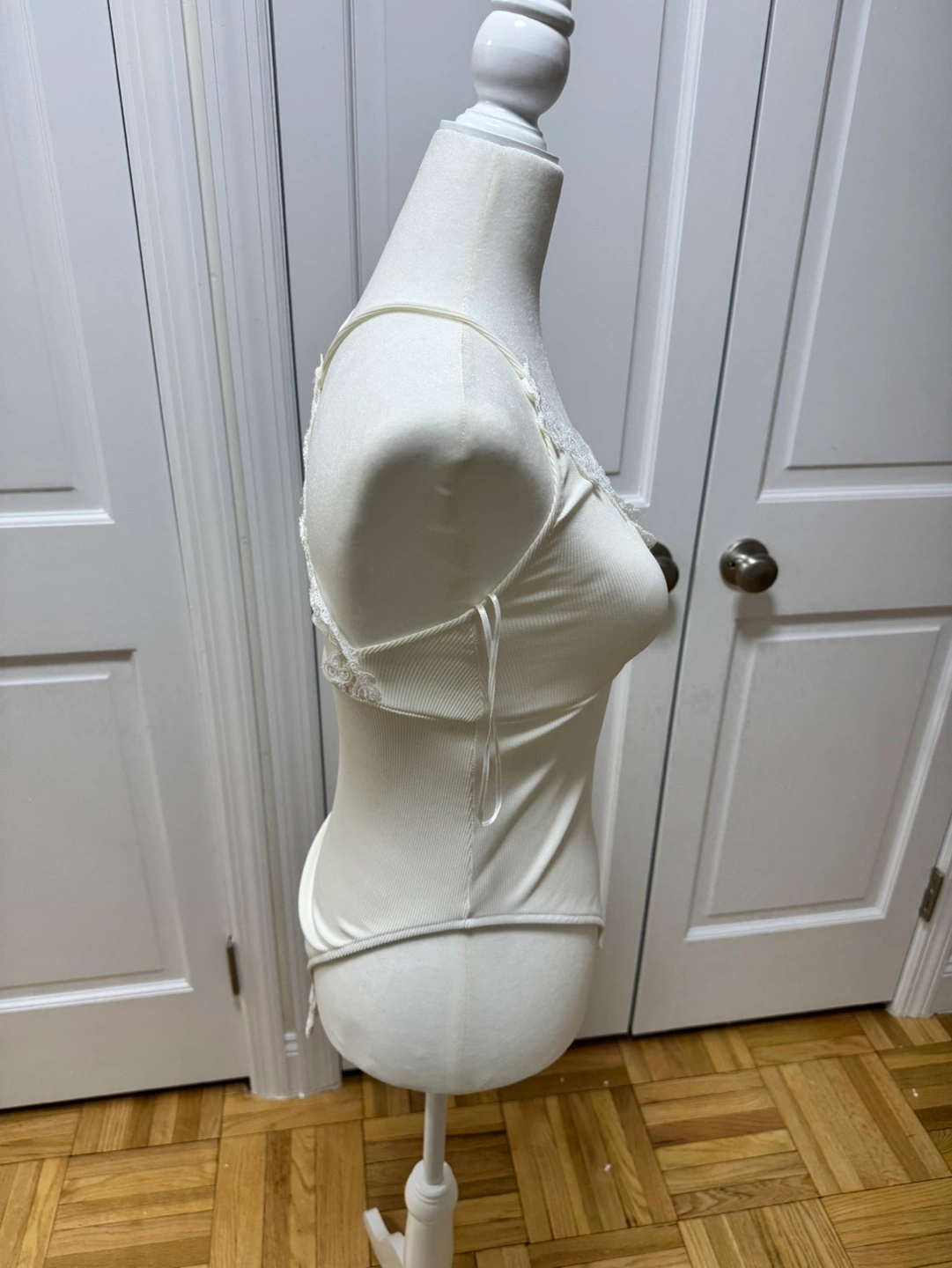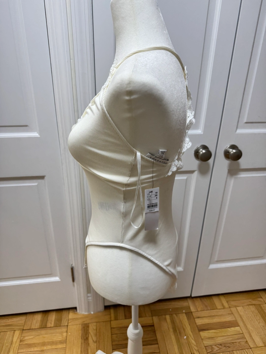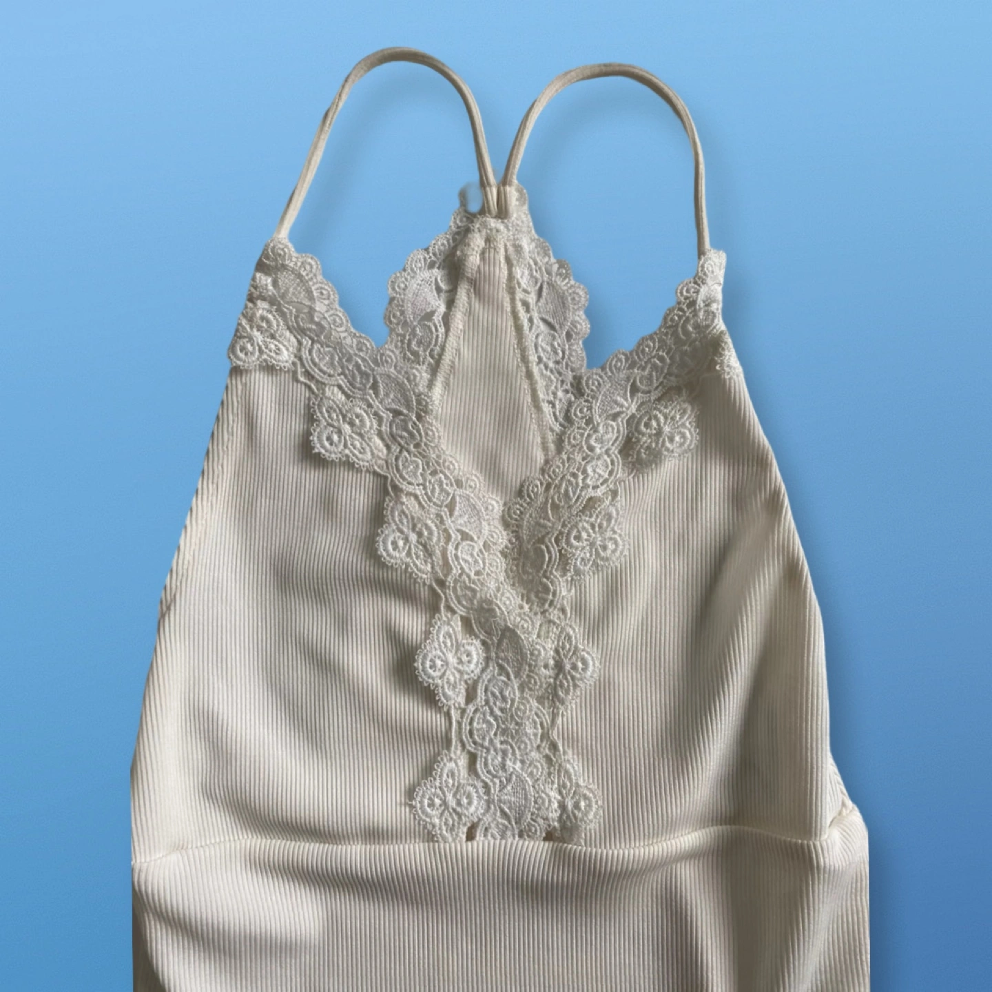 New with tags. Cream ribbed bodysuit. Features delicate lace detailing at neckline and back. Retails $35