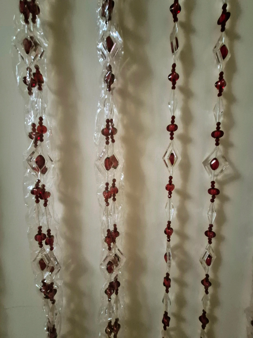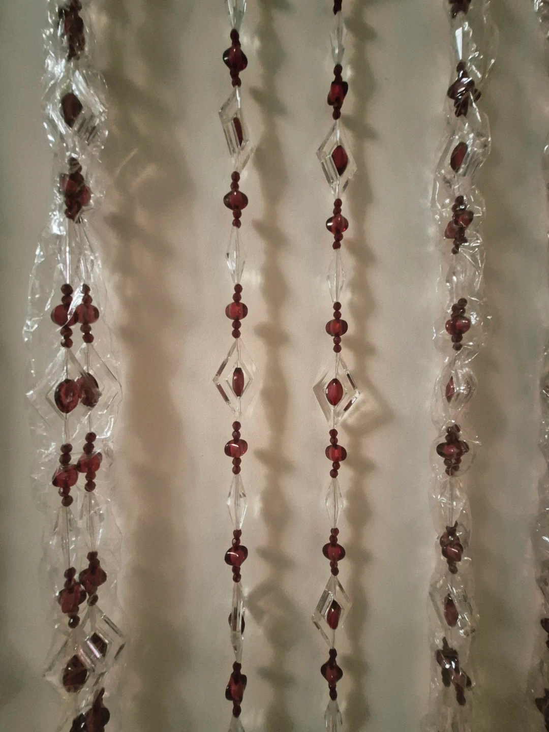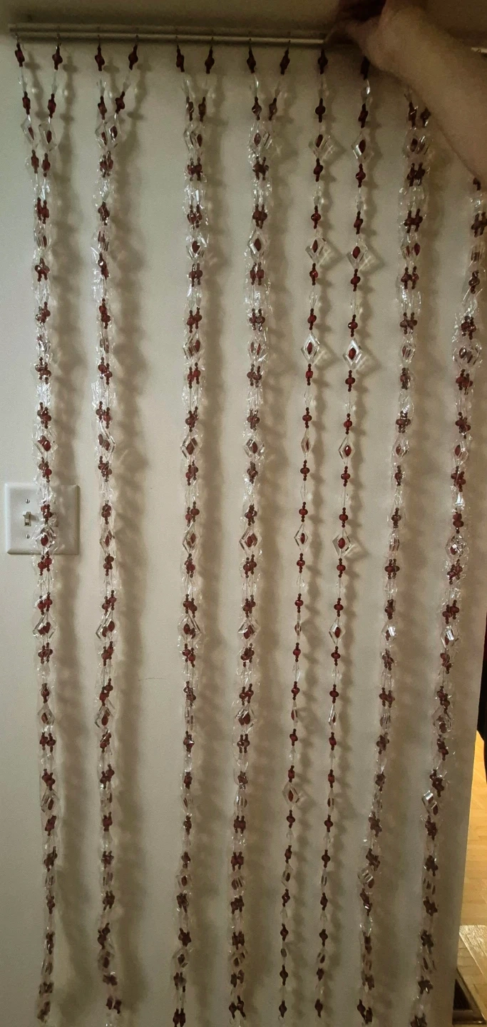 Add a touch of elegance to your space with this Yong Jin Craftgift beaded curtain! It features clear and red beads arranged in a diamond pattern. The curtain comes in its original box, ready to hang and transform any doorway or window.