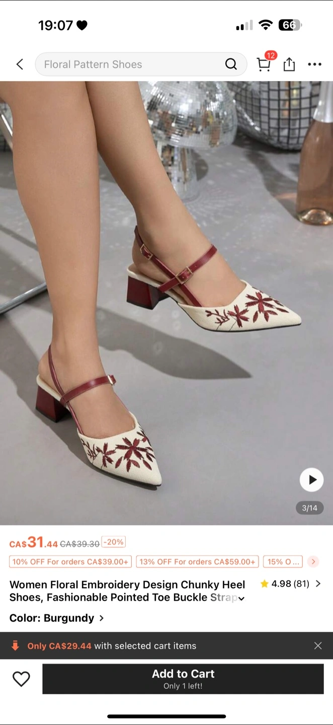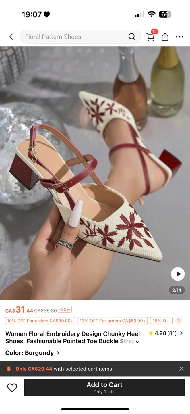Check out these stylish burgundy floral embroidery design chunky heel shoes! They feature a fashionable pointed toe and buckle strap. Originally CA$31.44