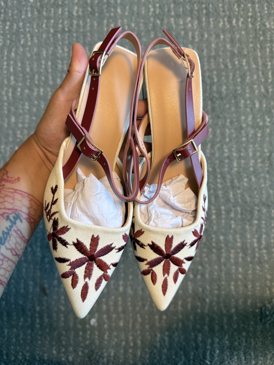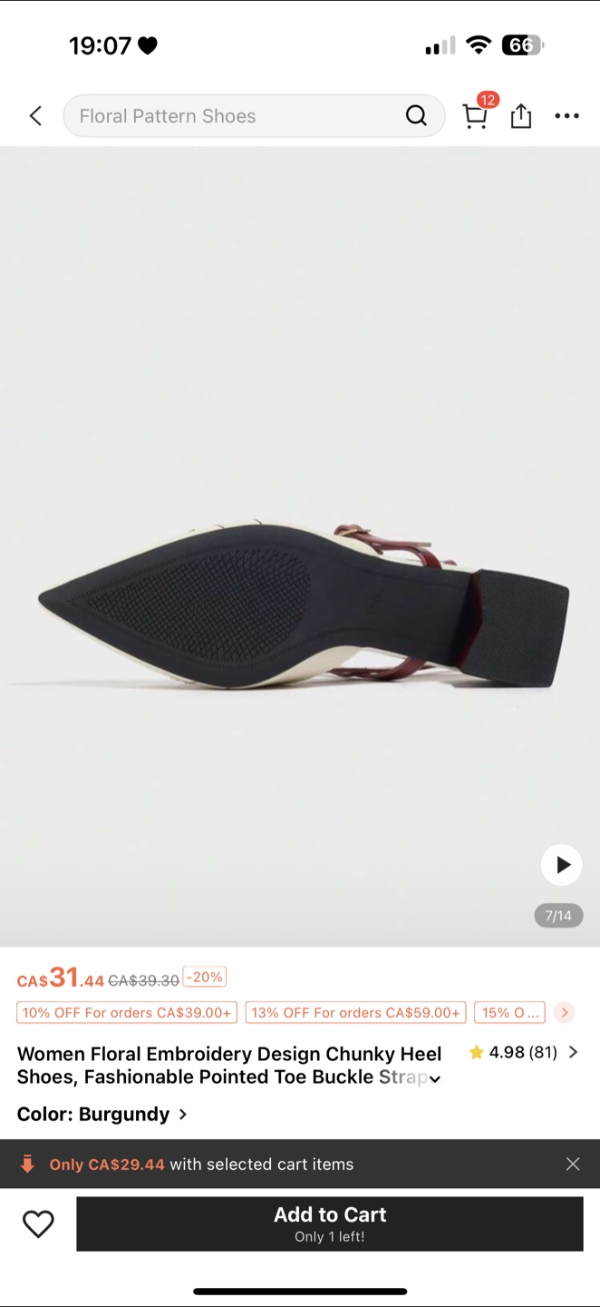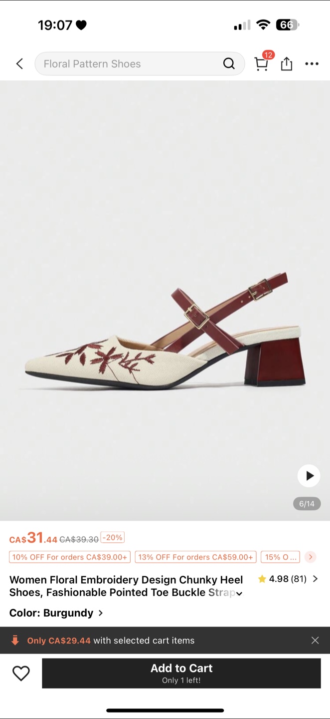Check out these stylish burgundy floral embroidery design chunky heel shoes! They feature a fashionable pointed toe and buckle strap. Originally CA$31.44