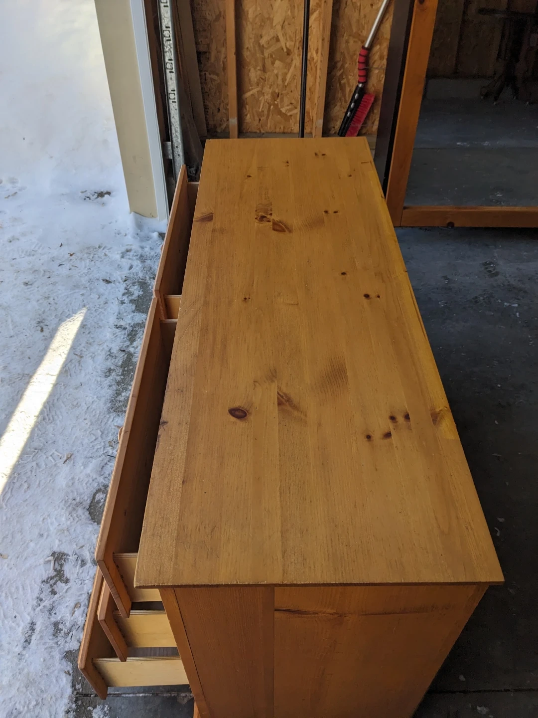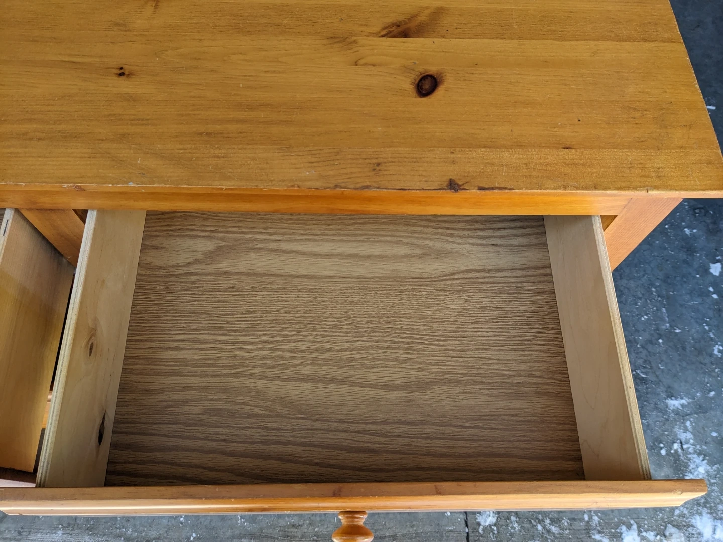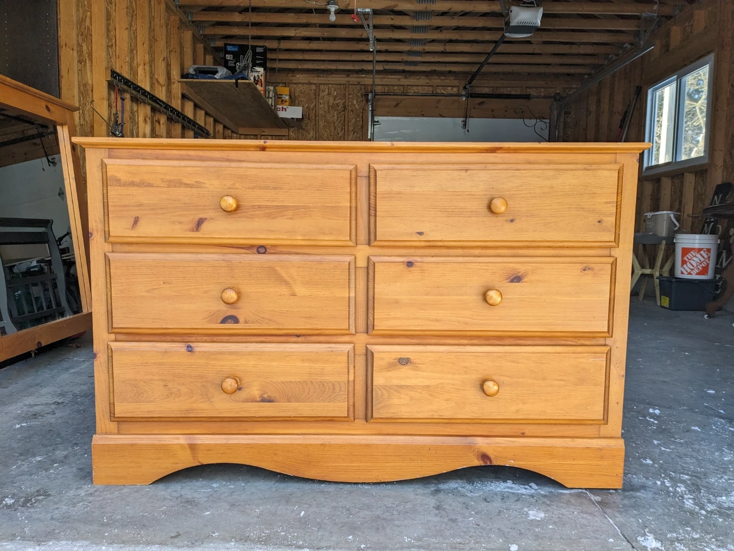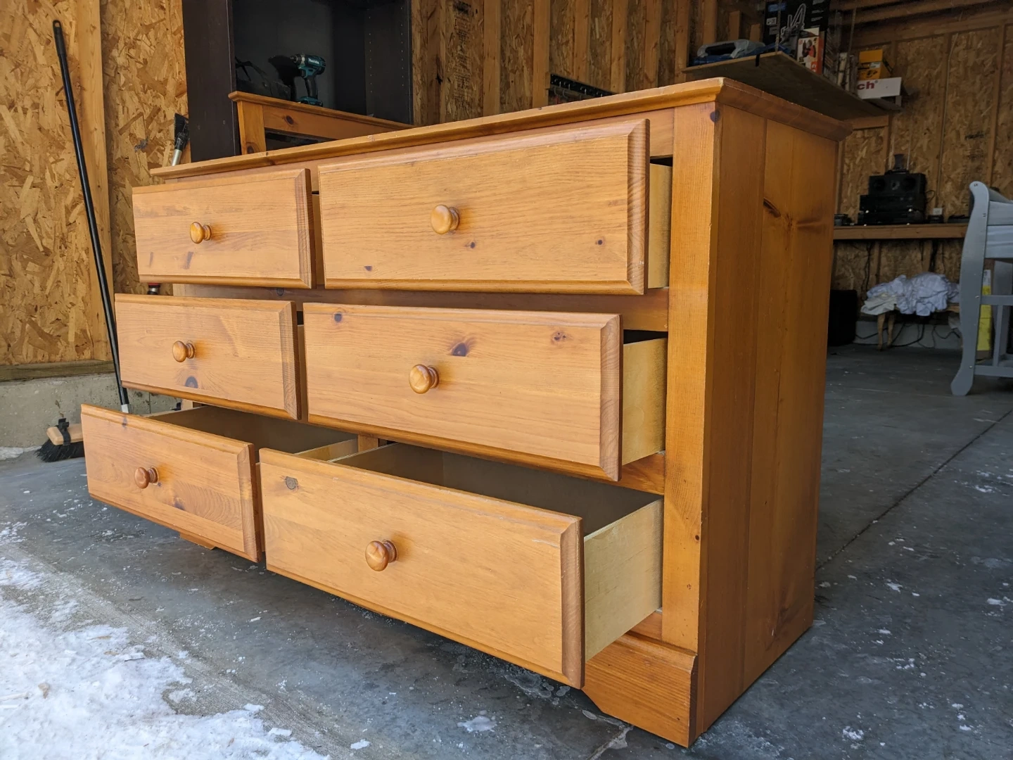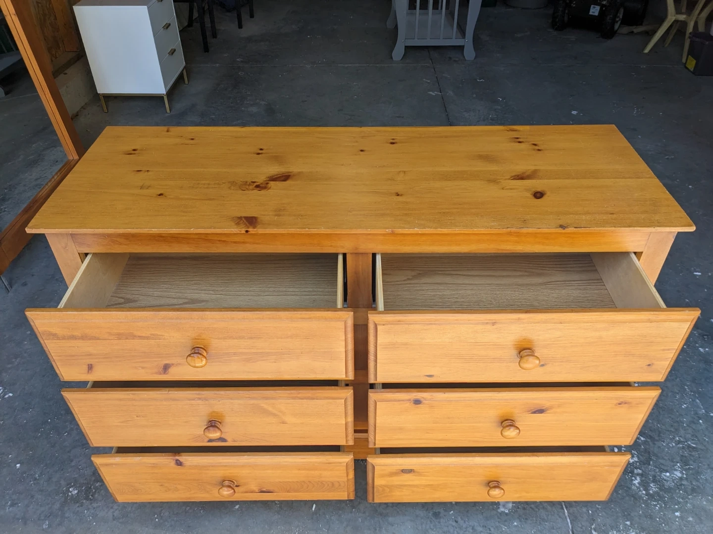 This dresser in solid pine features 6 spacious drawers that all open and close smoothly on their guides. The drawer interiors are all in very good condition. This is a solid and sturdy well crafted piece that is built to last and due to the lighter weight nature of pine, is easier to move around your space.
