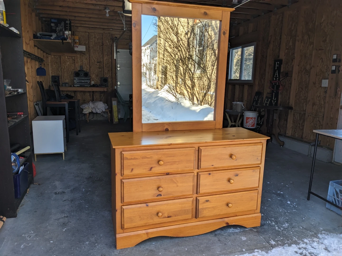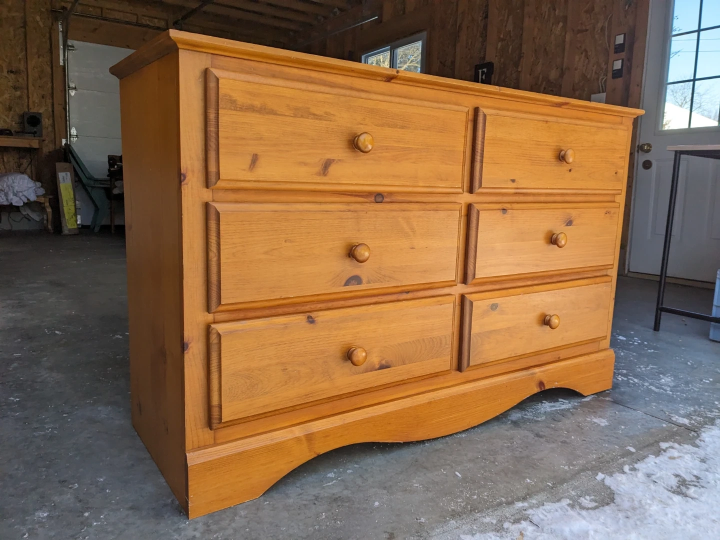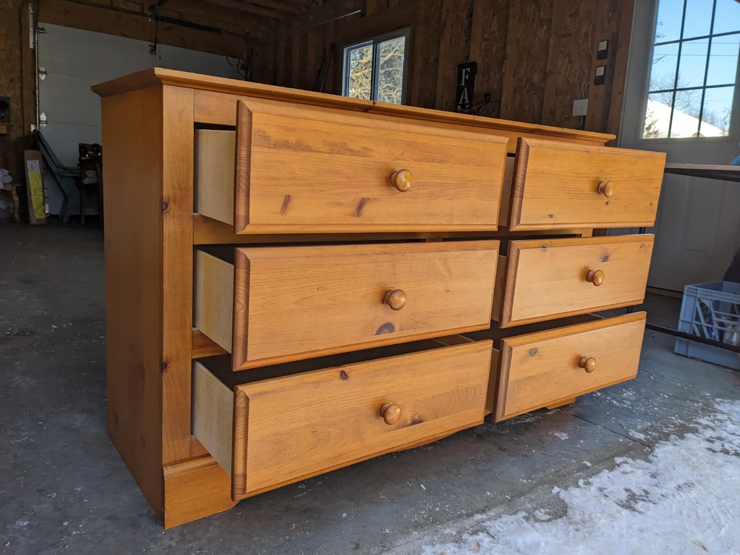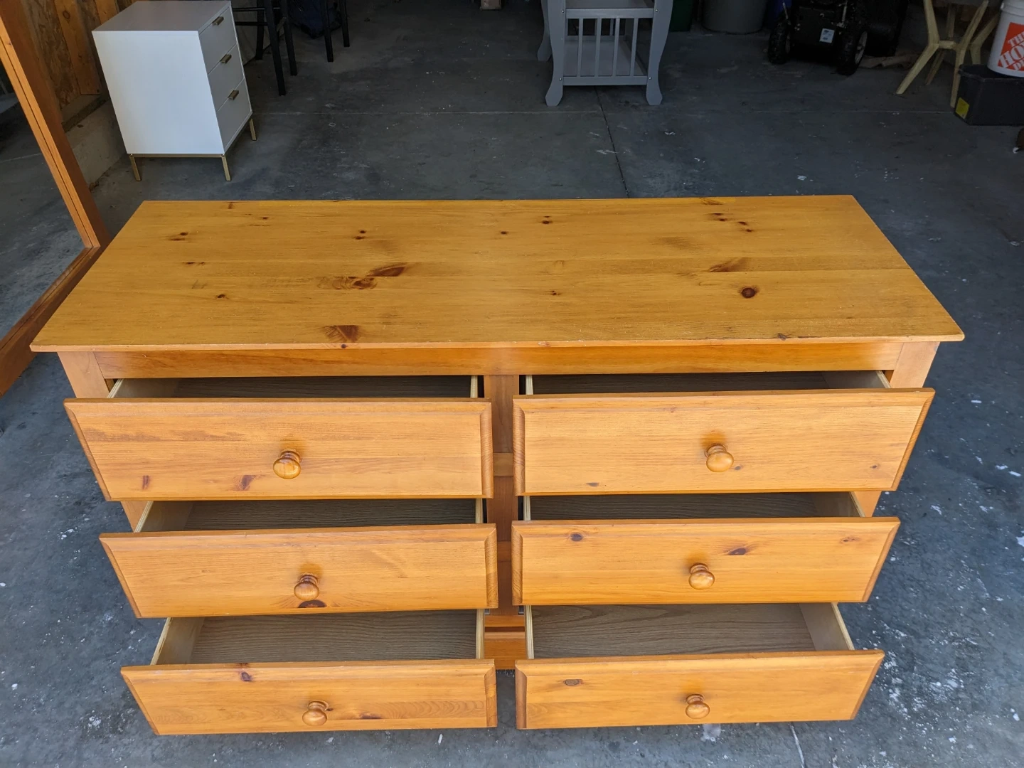This dresser in solid pine features 6 spacious drawers that all open and close smoothly on their guides. The drawer interiors are all in very good condition. This is a solid and sturdy well crafted piece that is built to last and due to the lighter weight nature of pine, is easier to move around your space.