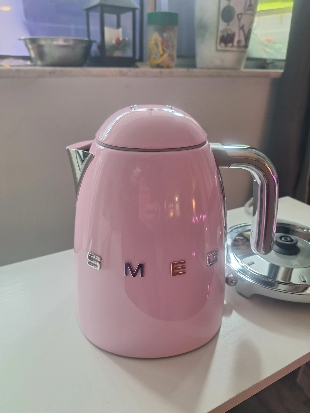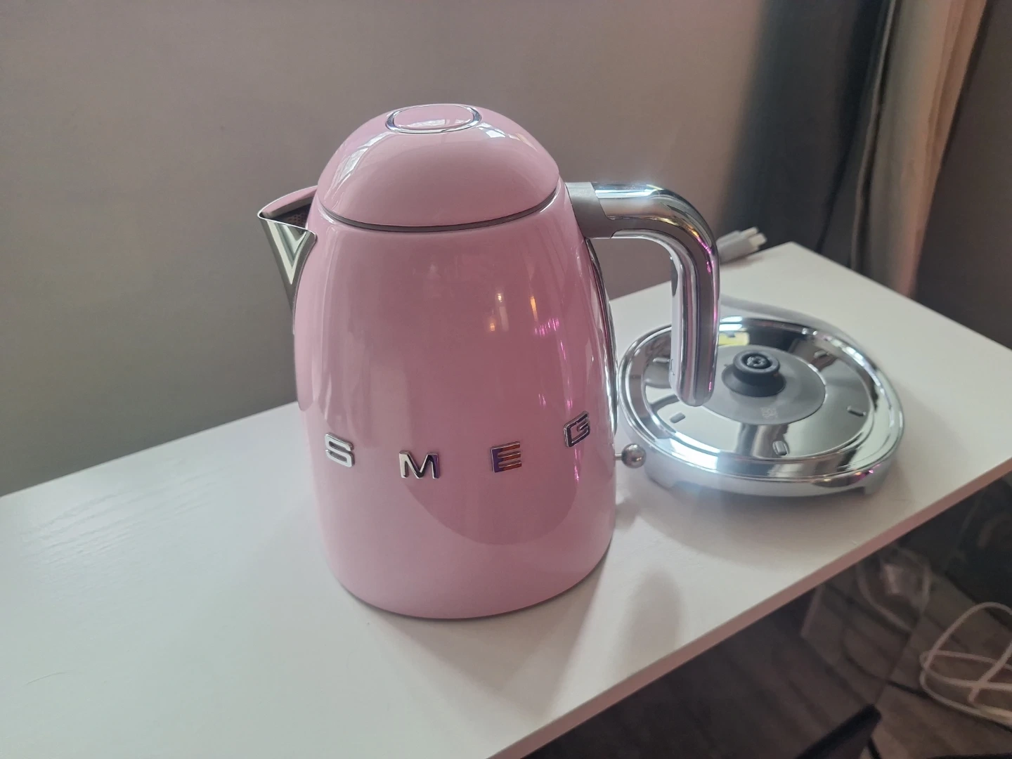 Smeg 50's Retro Style Kettle, 1.7L. This pastel pink kettle features automatic shut-off and a soft-open lid. It's made of stainless steel and includes a 360° swivel base. Brand new, never used, but no box. Missed the return date, receipt attached