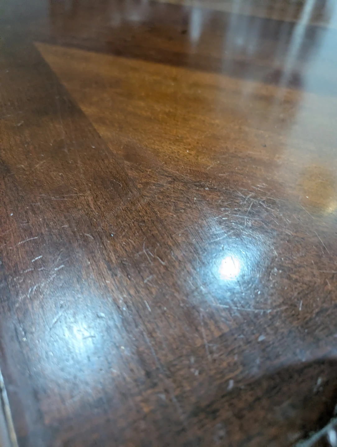 Dark wood dining set with six chairs. Table has a smooth finish. Chairs are upholstered with a neutral fabric. Made in Italy