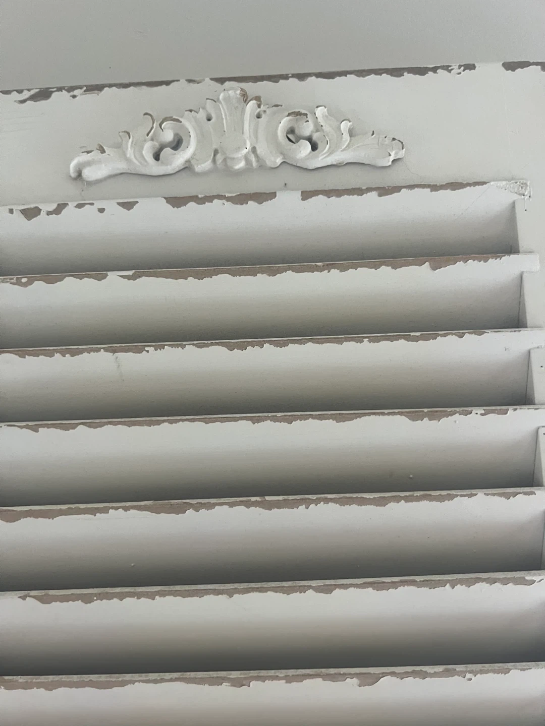 Selling a vintage white window shutter. It has a charming, distressed look that would be perfect for adding a touch of rustic style to your home decor. It's a unique piece that could be used as a decorative accent or repurposed for a creative project