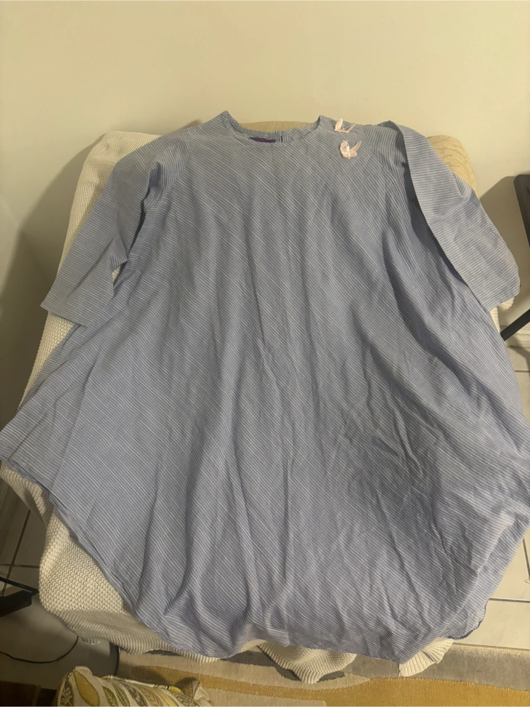 A cute blue striped dress with little bows on the shoulder! It's in great condition and ready for a new home