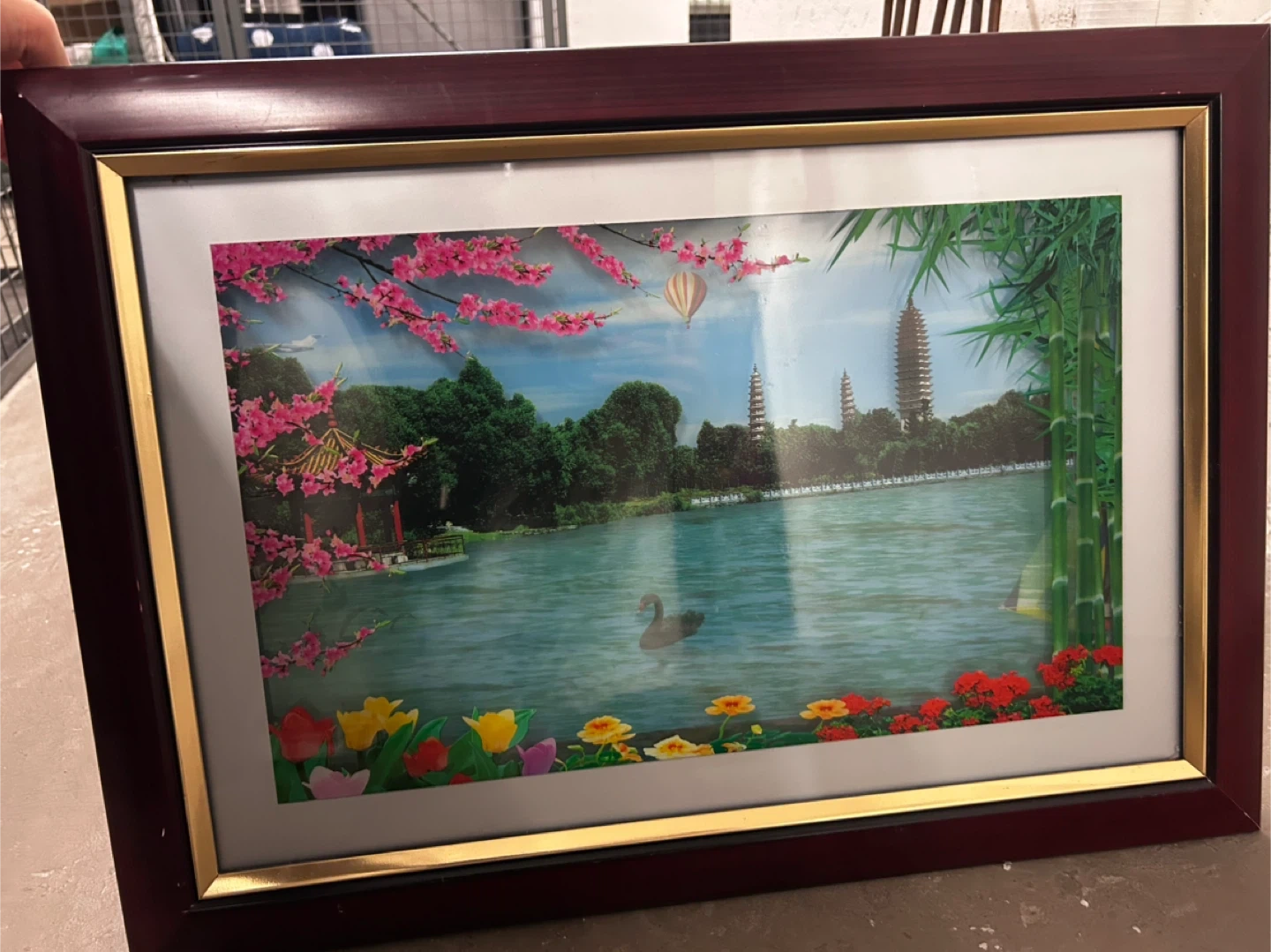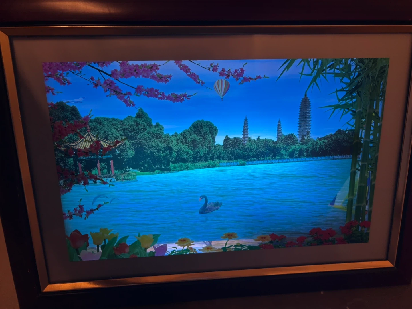 This digital photo frame displays a serene Asian landscape scene with pagodas and cherry blossoms. It features a built-in light with an on/off switch for illumination. The frame has a dark wood finish and a gold inner accent.