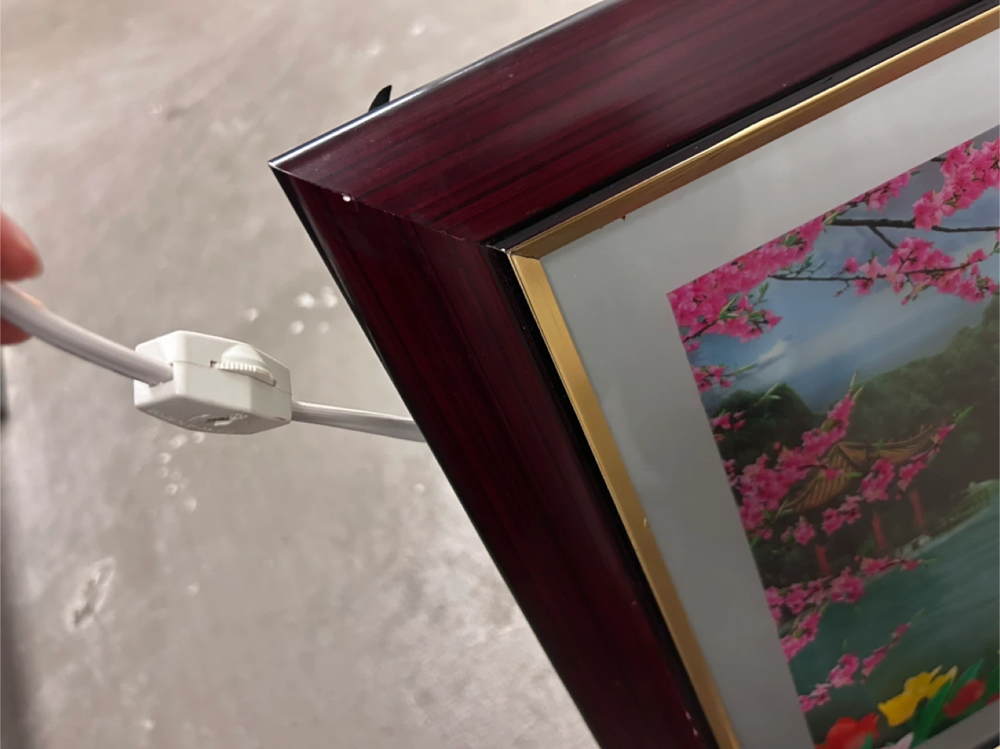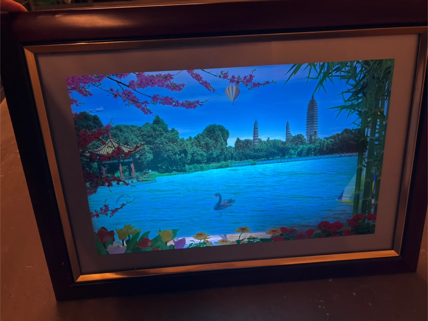 This digital photo frame displays a serene Asian landscape scene with pagodas and cherry blossoms. It features a built-in light with an on/off switch for illumination. The frame has a dark wood finish and a gold inner accent.