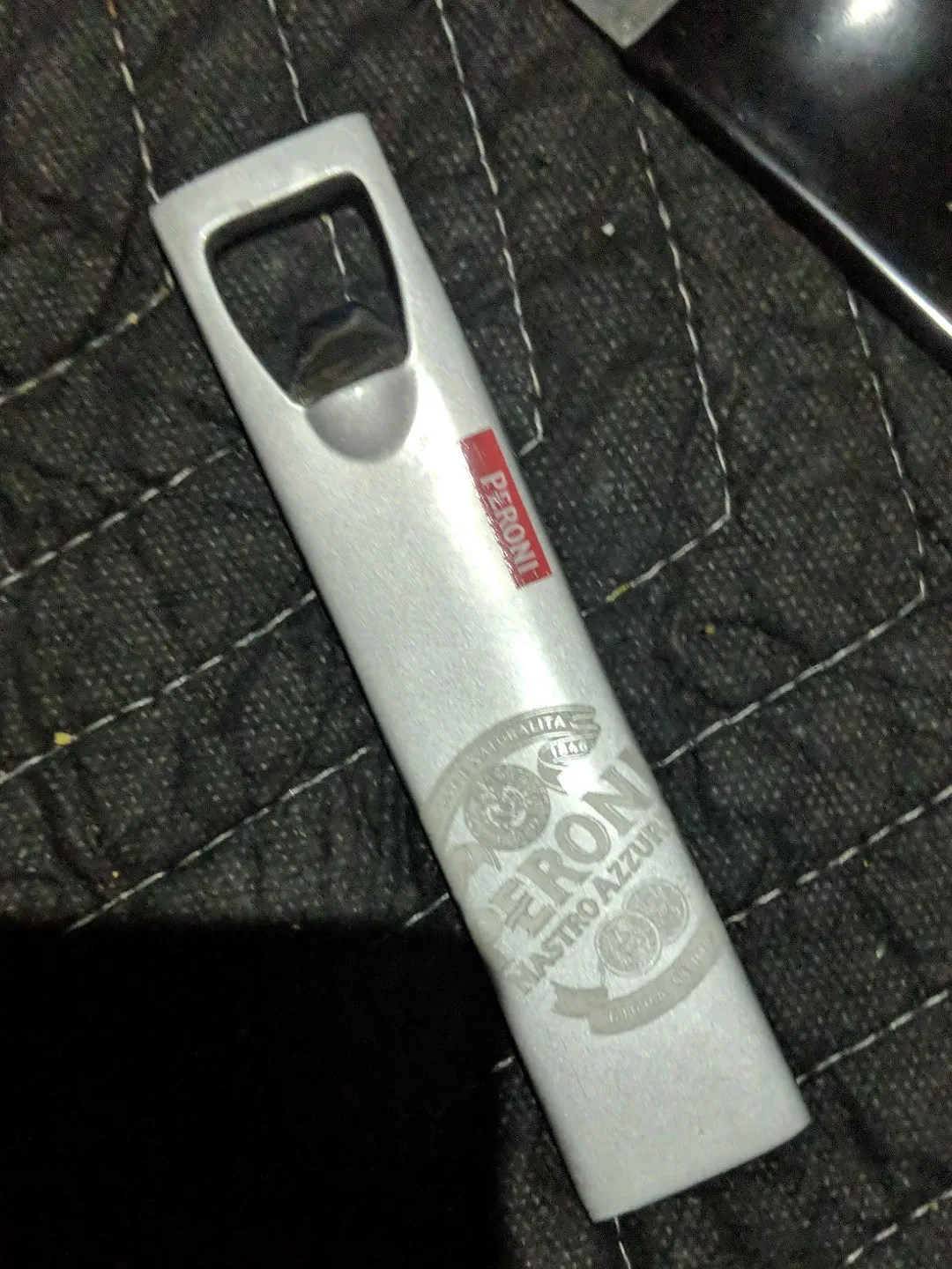 This is a Peroni Nastro Azzurro branded bottle opener. It's made of metal and features the Peroni logo. Perfect for opening your favourite Peroni bottles!
