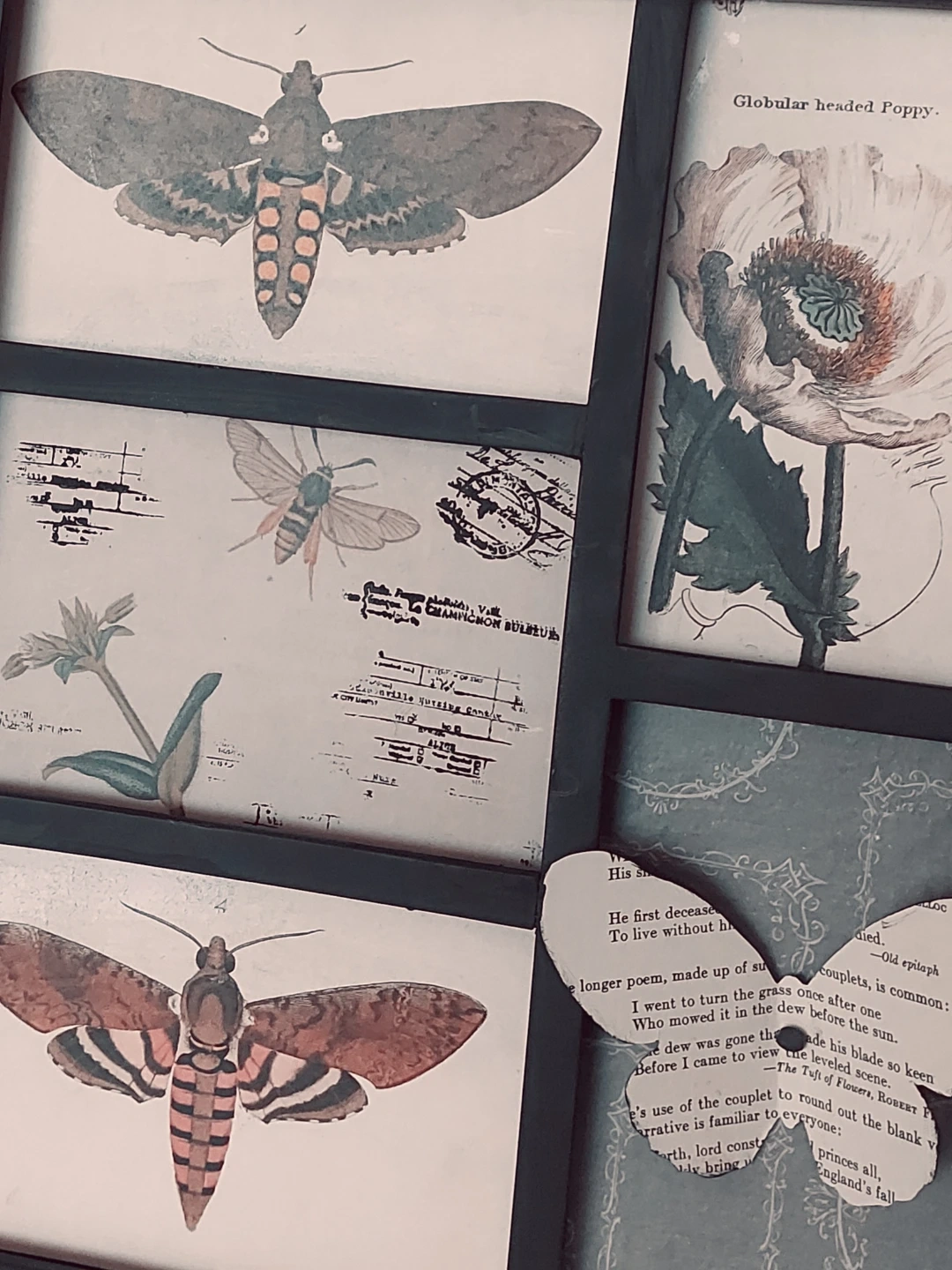 Add a touch of vintage charm to your home with this botanical collage! It features a collection of lovely prints, including moths and poppies, arranged in a stylish grid. Perfect for adding a unique and artistic flair to any room in your home. 14" x 16"