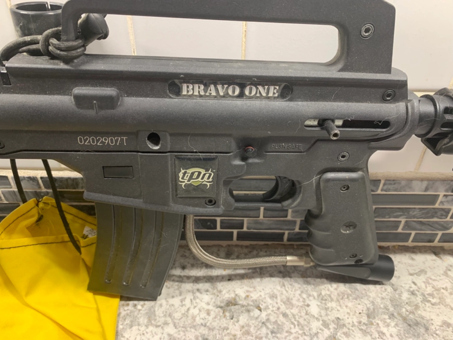 Tippmann Bravo One paintball marker. Includes a remote line, hopper, and barrel. Used condition. Sold as is.