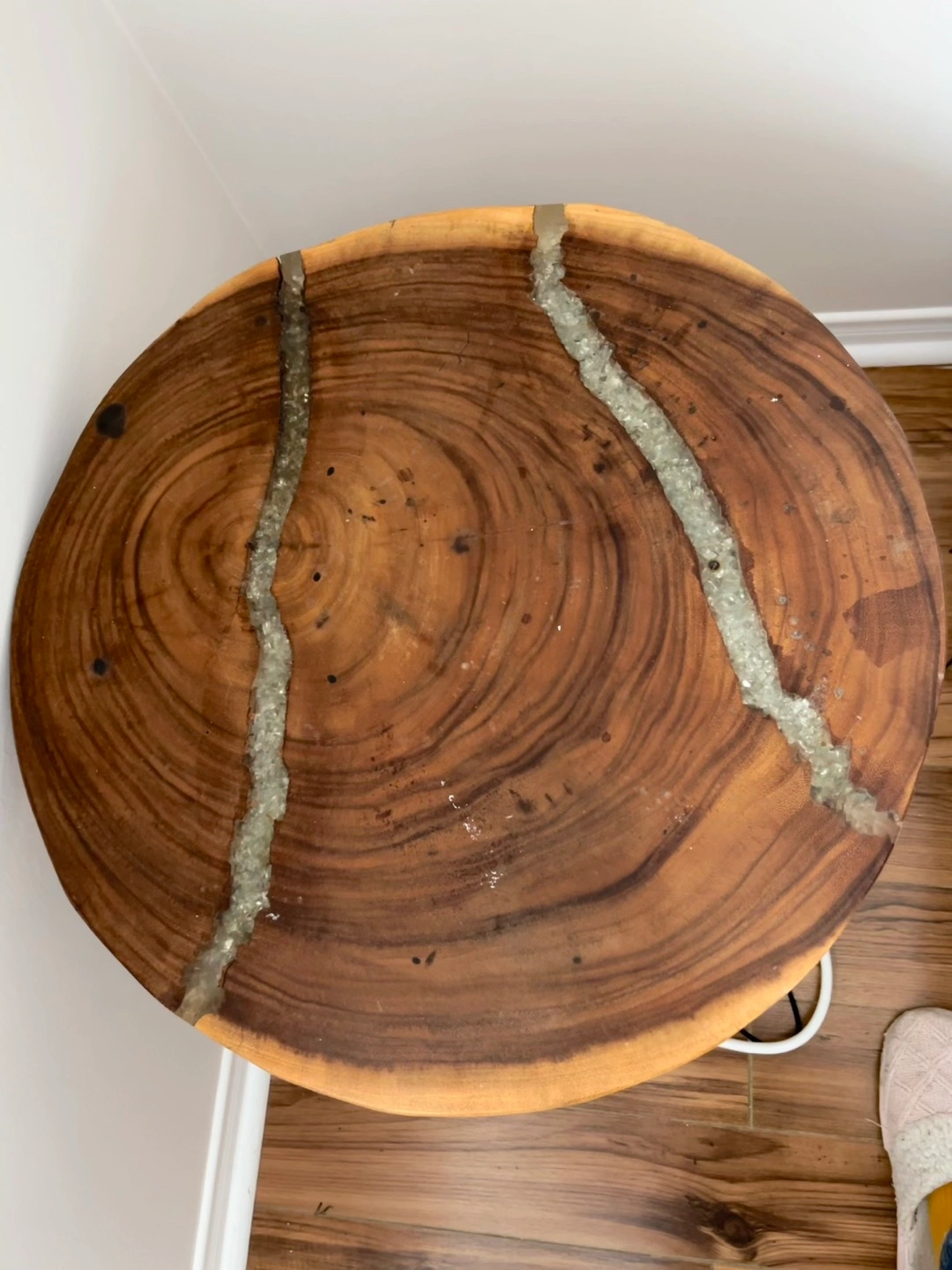 Selling a unique round accent table! It features a beautiful wood grain with a clear resin inlay, adding a touch of modern rustic charm to any space. The black metal legs provide sturdy support and a sleek contrast to the natural wood. Perfect as a side table or a statement piece!