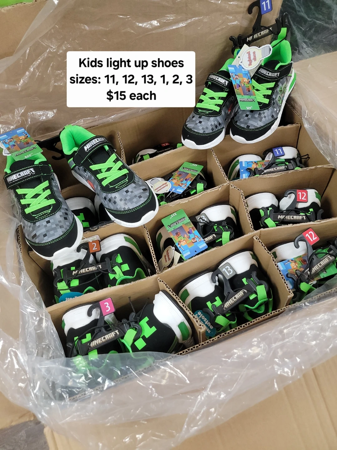 Get these awesome kids' light-up shoes featuring a Minecraft design. They come in sizes 11, 12, 13, 1, 2, and 3. Perfect for young fans who love to play and show off their cool kicks!