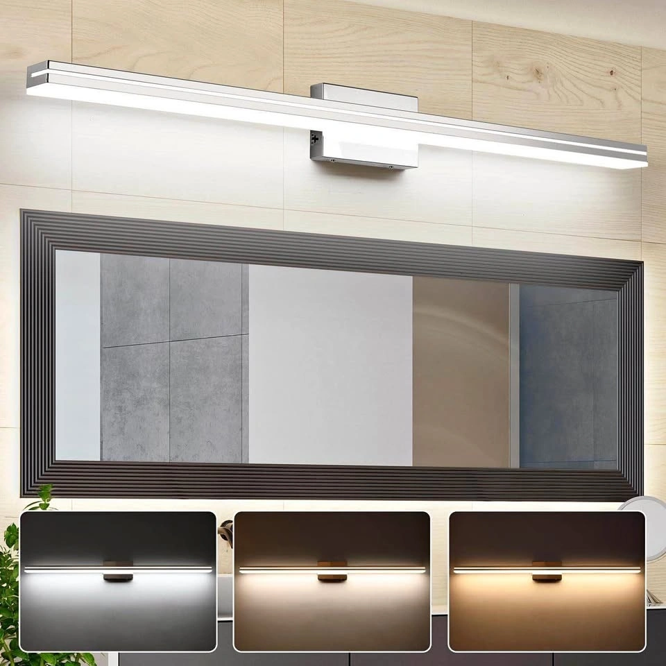 This 48-inch SineRise LED vanity light bar offers a modern look for your bathroom. It features advanced electroplate craft and sealing technology, making it dust-proof, fog-proof, anti-corrosion, and moisture-proof, perfect for humid environments. The frosted white solid acrylic lampshade is durable and provides excellent downlighting without glare. It's an energy-saving 36W LED light, providing brightness comparable to a 180W incandescent bulb. You can choose between three color temperatures (3000K, 4000K, or 6000K) to set the right ambiance. The light is fully dimmable with a compatible dimmer switch (not included). Easy to install with ETL/UL approved power driver and IP44 waterproof rating.