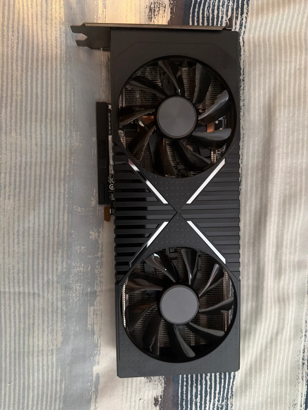 NVIDIA GeForce RTX graphics card with two fans. Features multiple display outputs, including HDMI and DisplayPort. It's ready for gaming and demanding applications.