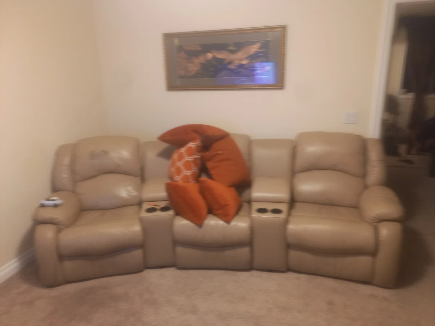 This light beige leather sofa features two recliners with built-in cup holders. It's great for creating a cozy home theatre experience. The sofa is made of durable leather material.