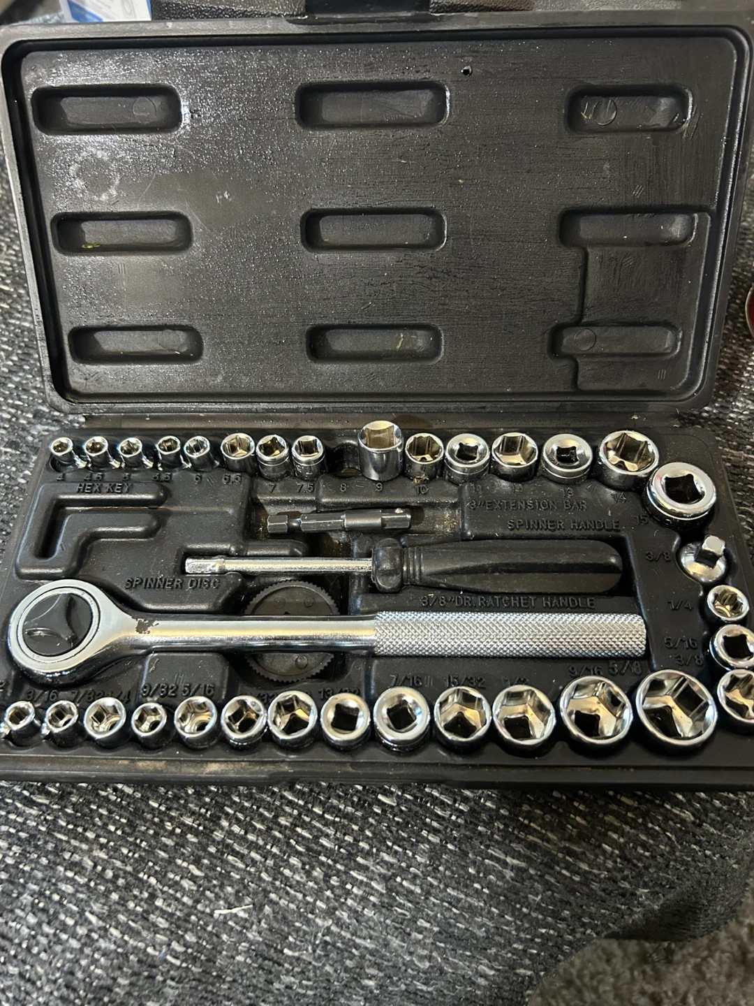 This is a 3/8" drive socket set including a ratchet handle, extension bar, and spinner handle. It comes with a variety of sockets. Includes original case. Useful for various mechanical tasks!