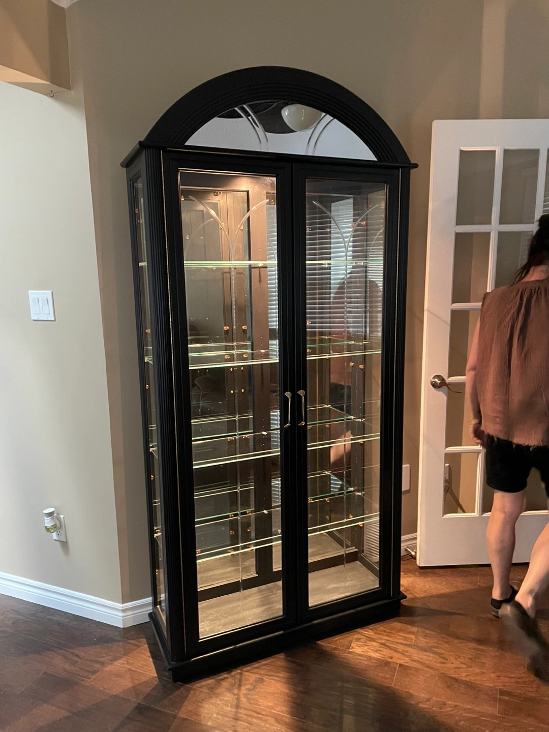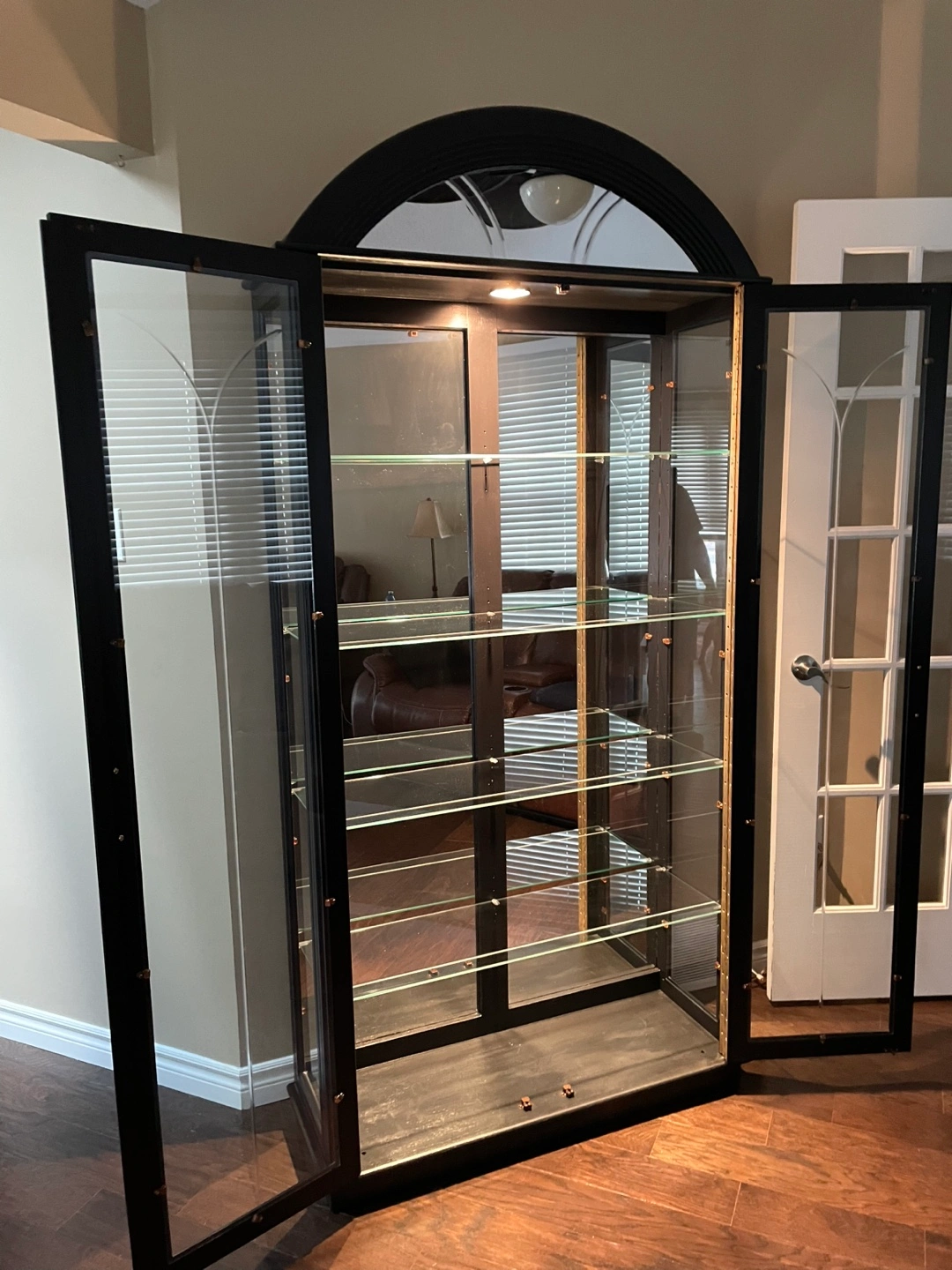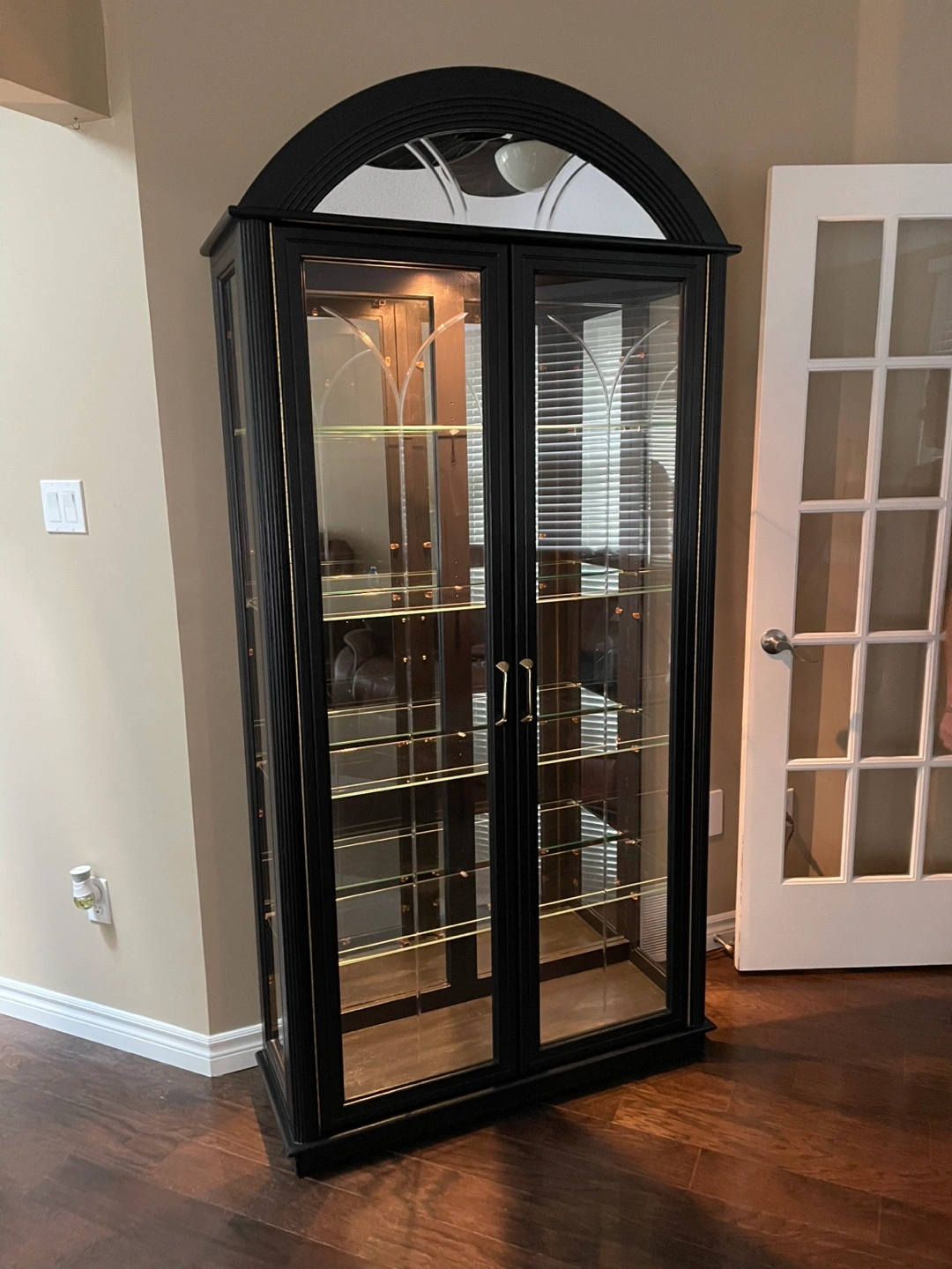Selling a lovely black glass display cabinet! It's in great shape and would be perfect for showing off your favourite collectibles or dishes. It features glass shelves and doors, and the black finish gives it a sleek, modern look