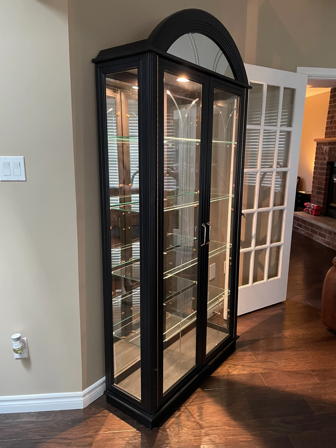 Selling a lovely black glass display cabinet! It's in great shape and would be perfect for showing off your favourite collectibles or dishes. It features glass shelves and doors, and the black finish gives it a sleek, modern look