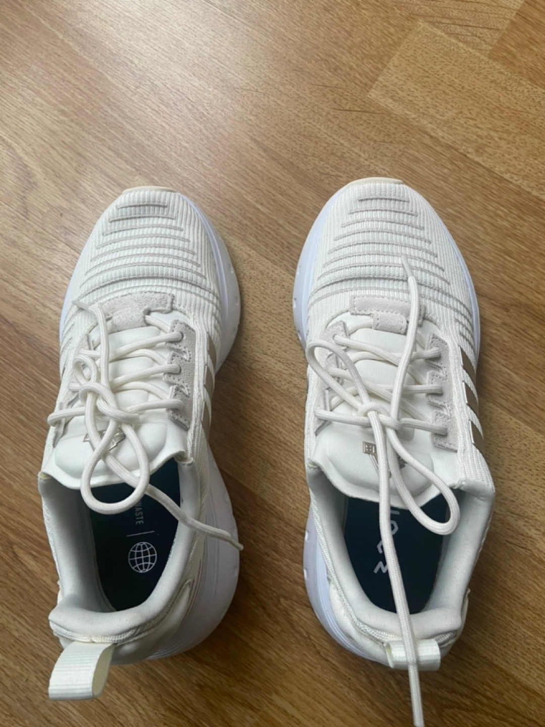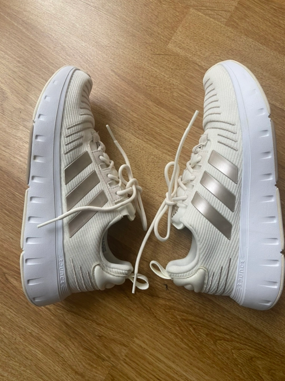 Cream-coloured Adidas running shoes. Lightweight and breathable design. Rose gold accents. Great for workouts or casual wear. Not used. Run a little bigger for me.