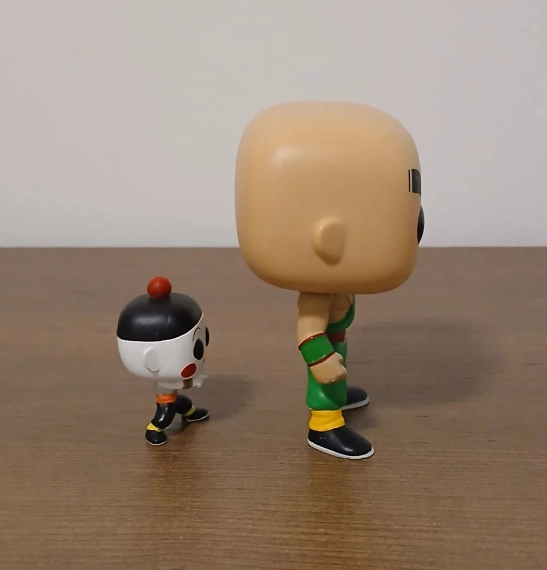 Two Funko Pop! vinyl figures featuring Tien Shinhan and Chiaotzu from Dragon Ball Z. Figures are made of vinyl. Great for collectors or fans of the series!