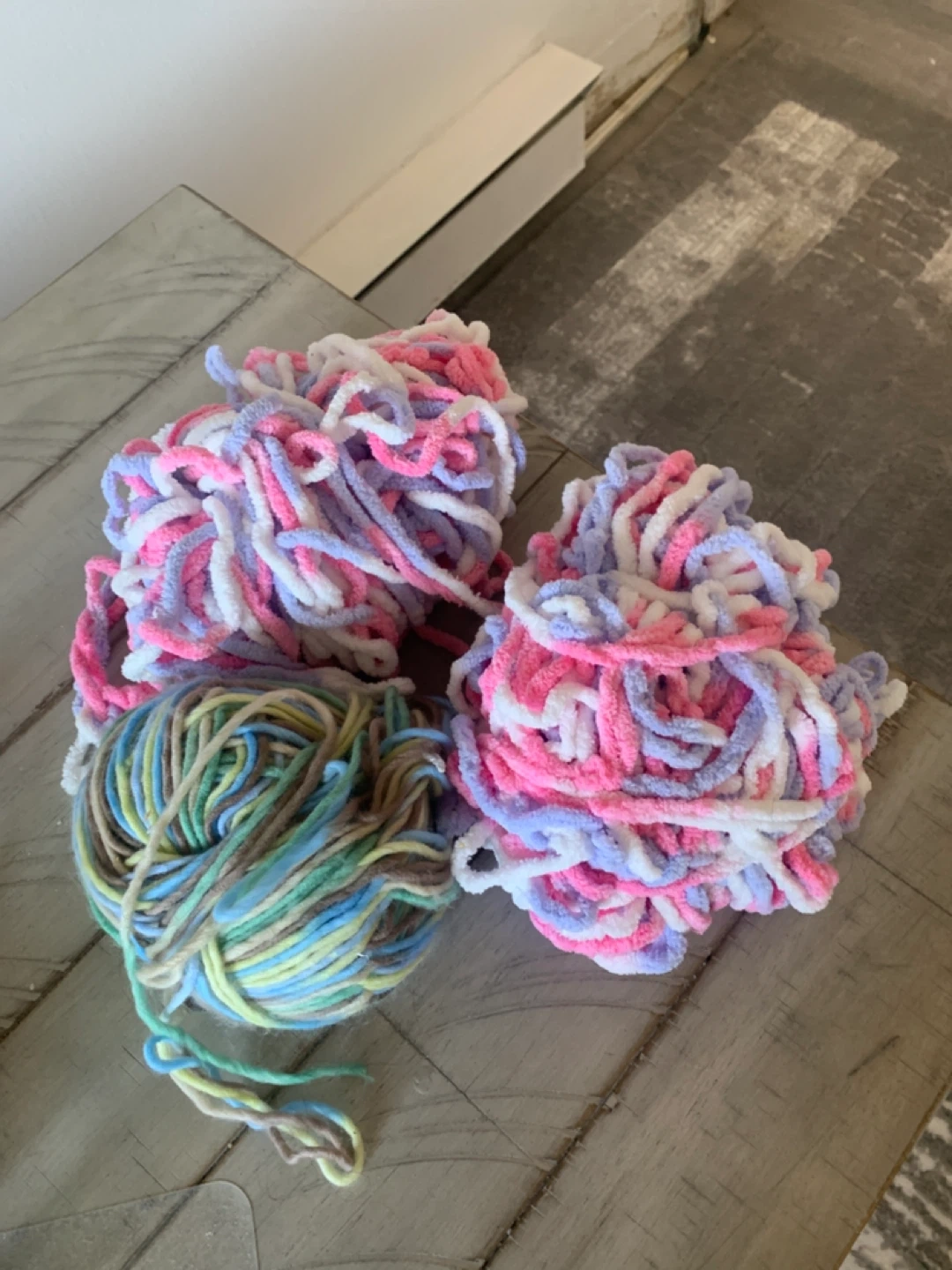 Lot of three balls of yarn. Two are a fluffy chenille-style yarn in pink, purple, and white. One is a more traditional yarn with streaks of green, blue, yellow, and brown. Perfect for various craft projects!