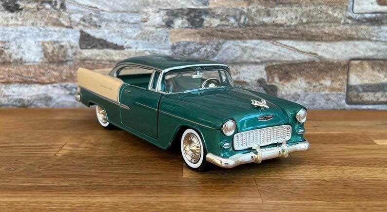 Diecast model car, Chevrolet Bel Air 1955. Made of metal, scale 1/24. A great collectible item. Dimensions are 21 cm by 8 cm (approx. 8.3" x 3.15").