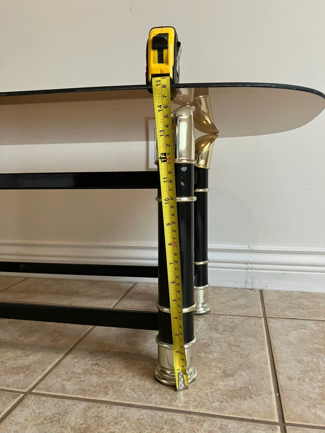 Smoked glass top coffee table featuring a black and gold bamboo-style leg design. It has a lower shelf for extra storage. A stylish addition to any living space!