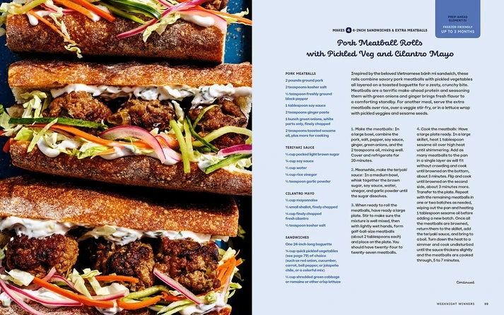 This cookbook features over 100 make-ahead recipes with low waste and high flavour. It offers prep-ahead tips and storage solutions. Recipes are inspired by Vietnamese Banh Mi sandwiches and include breakfast bites, lunch ideas, and main courses.