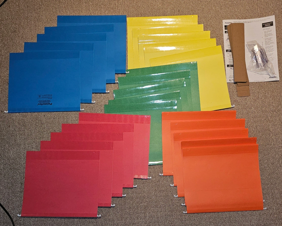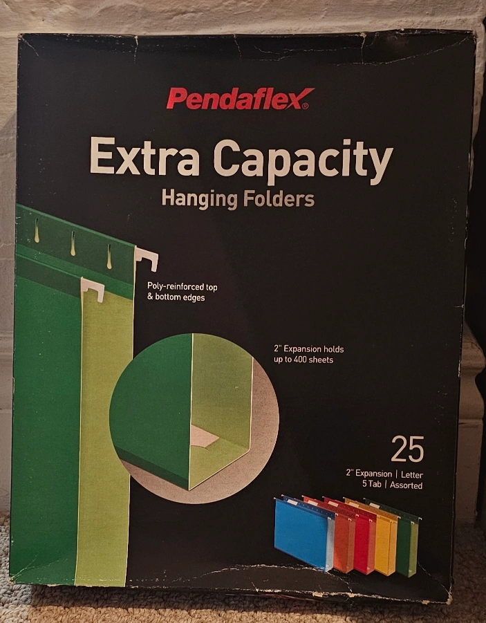 Box of 25 Pendaflex extra capacity hanging folders. Assorted colours. 2" expansion holds up to 400 sheets. Poly-reinforced top and bottom edges. New, never used.