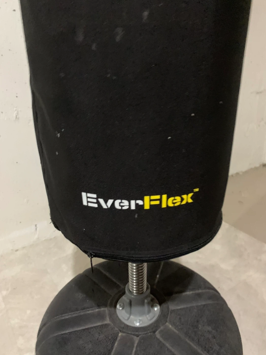 This is a black Everlast free-standing punching bag. It features a black EverFlex striking surface. The base is black and made of durable plastic. It's suitable for boxing and martial arts training.