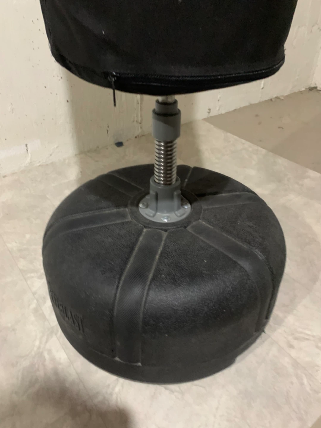 This is a black Everlast free-standing punching bag. It features a black EverFlex striking surface. The base is black and made of durable plastic. It's suitable for boxing and martial arts training.