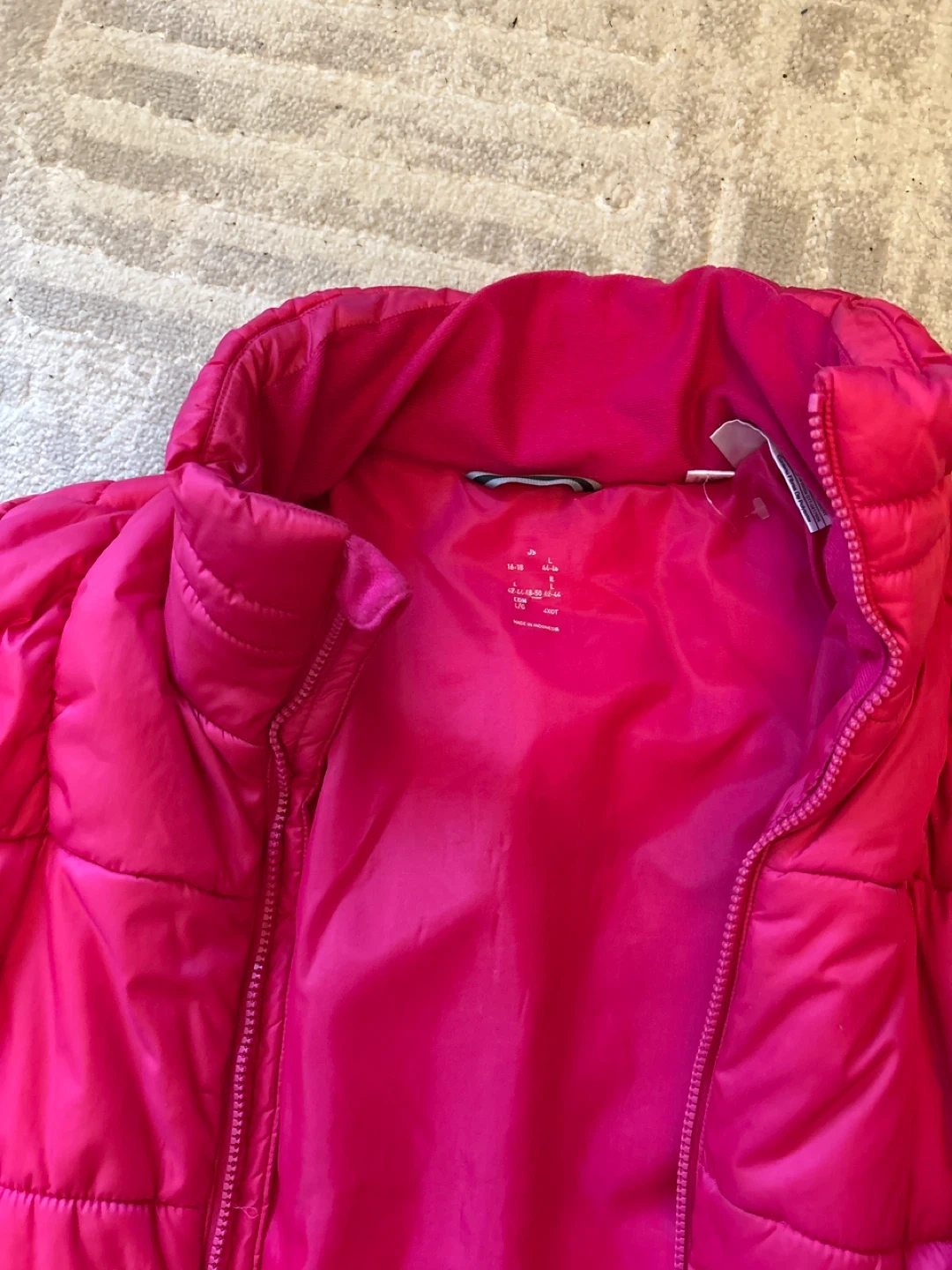 Selling a bright pink Adidas puffer jacket. It's in great condition and perfect for keeping warm on chilly days!