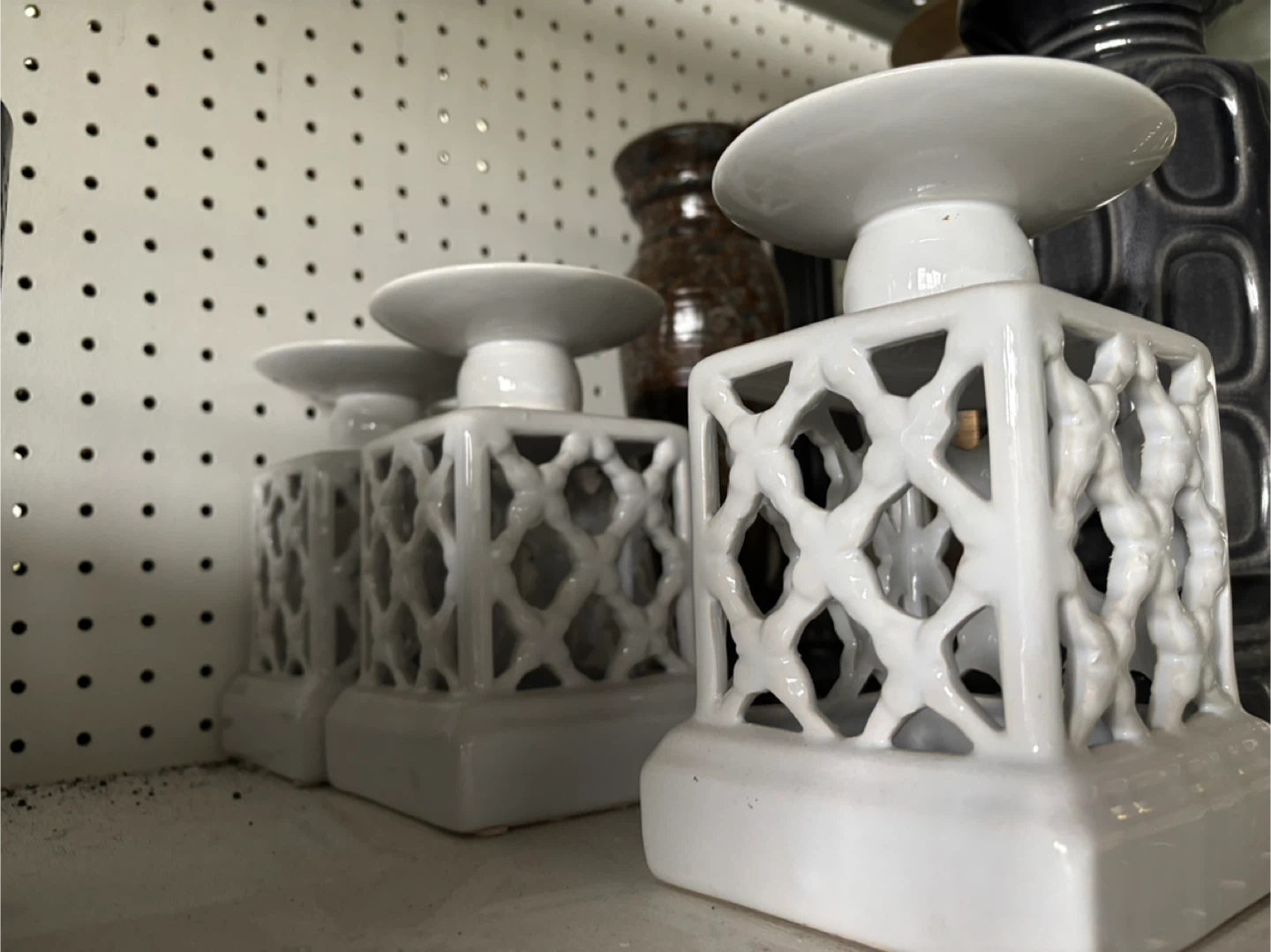 This set includes three white ceramic candle holders. Each holder features a square, lattice-style body with a round top to hold a candle. They are made of ceramic.