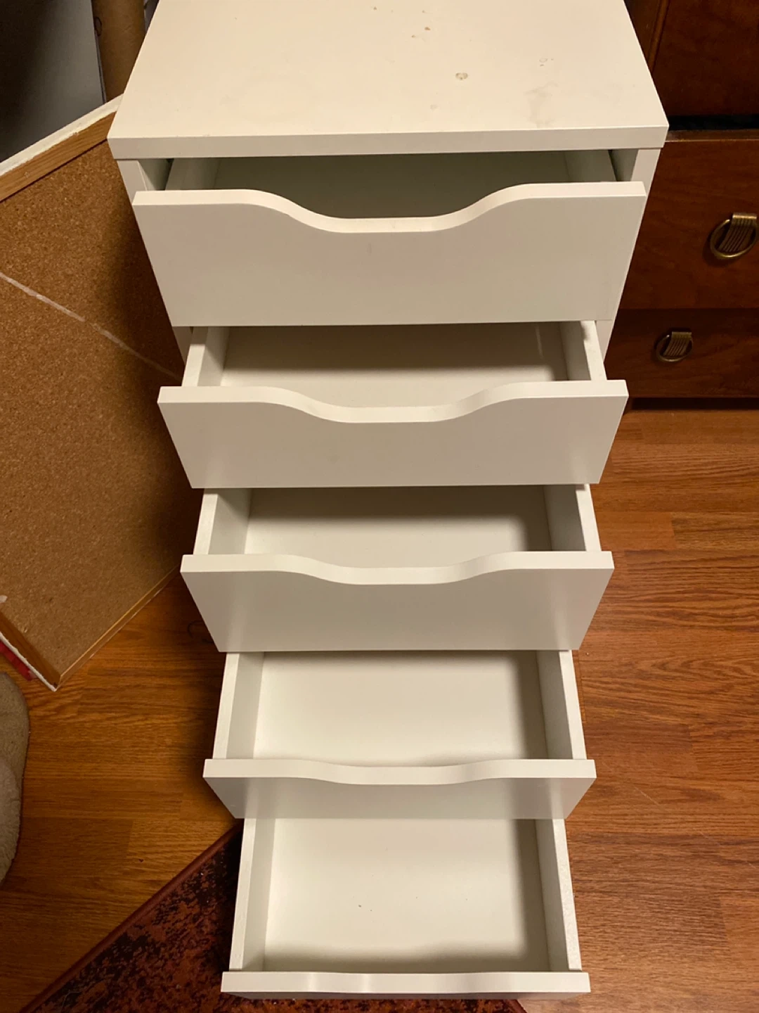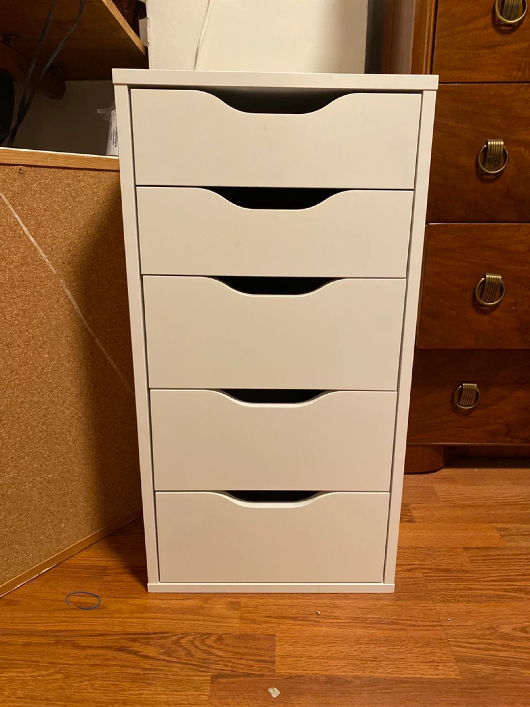 Selling a white IKEA Alex drawer unit with 5 drawers. It's in great shape and perfect for organizing your space. This unit is super handy for storing all sorts of things!
